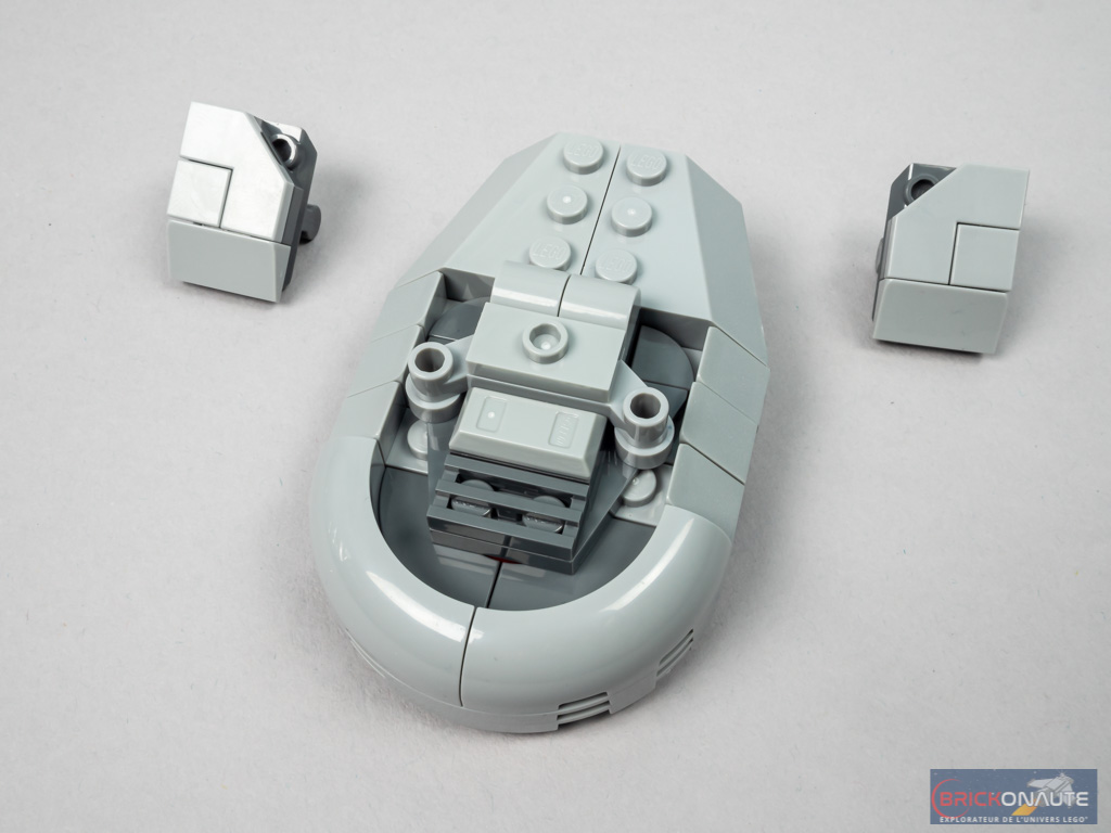 Le designer en a intégré quelques unes – je vais donc en parler rapidement. Hormis le positionnement laborieux des pattes dont je parle un peu plus haut, on notera d’autres éléments mobiles. Sous la tête, lorsqu’on tire un canon, l’autre rentre. Une manette située à l’intérieur permet d’orienter la tête – on peut tout aussi bien le faire depuis l’extérieur, je ne vois donc franchement pas l’intérêt. On peut également ranger les deux speeder bikes dans le garage prévu à cet effet et qui peut en contenir 4 – c’est un peu dommage. Bref, vous l’aurez compris si vous avez lu jusqu’ici : ce set est clairement destiné à l’exposition et pas au jeu. Même si les habitués des UCS savent généralement à quoi s’en tenir avec ce type de sets, c’est tout de même bon de le souligner.