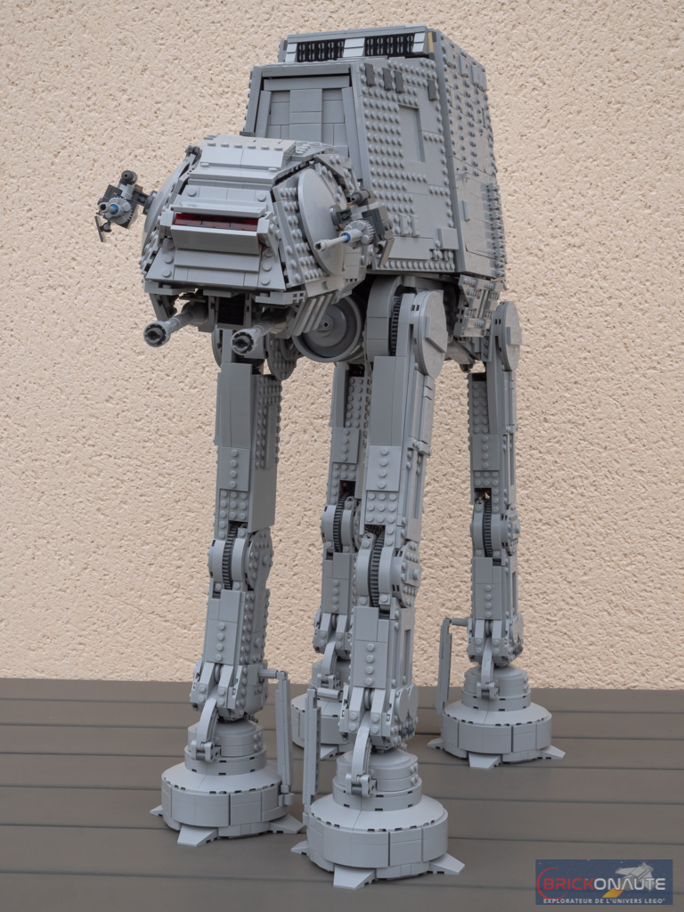 C’est gros, mais ça n’en reste pas moins très bien réalisé. Sur l’extérieur, les détails fourmillent. Et l’ensemble parait cohérent comparé à son alter-ego cinématographique, qu’il s’agisse de ces fameux détails ou des proportions générales de l’ensemble. On regrettera peut-être simplement les quelques vides qui subsistent entre les panneaux de blindage, ou entre les différents éléments constituant le cou. Les pattes laissent également apparaître, chacune, deux trous permettant d’accéder à un axe Technic pour régler leur orientation – j’y reviendrai un peu plus bas.