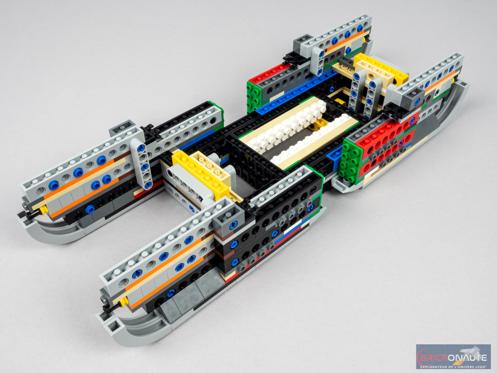 Nous commençons cette étape par l’assemblage d’une nouvelle structure Technic, que l’on couvre ensuite de plates afin de servir de plancher pour le niveau supérieur. Deux beams traversent la structure et viennent se fixer sous le plancher bas, permettant de rigidifier la structure. Deux rangées de sièges sont ajoutées à l’avant du pont supérieur, fixées d’un côté sur une charnière et de l’autre sur un ball joint. On complète le plancher, puis on ajoute une vingtaine de sièges supplémentaires.