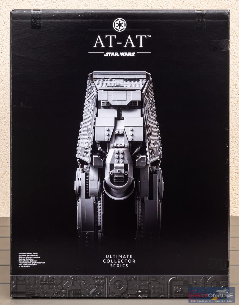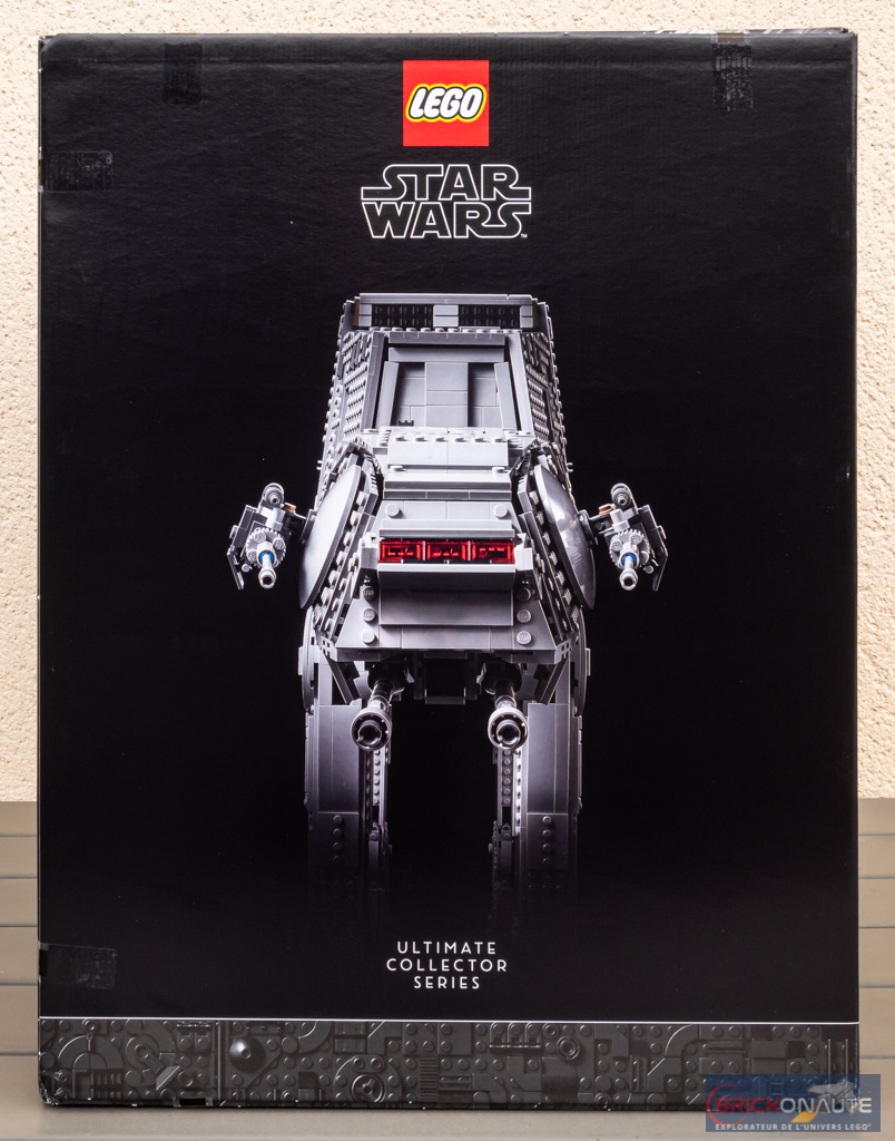 Sur la face avant, le modèle nous est présenté légèrement de profil sur le fond noir habituel des sets LEGO destinés aux adultes. Le nom du set est surmonté du symbole de l’Empire Galactique – avec une petite mention Star Wars en dessous, sait-on jamais.