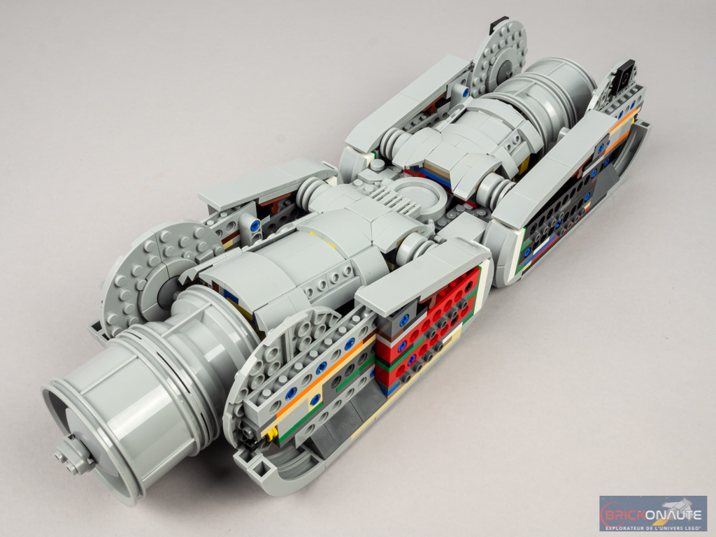 L’intérieur est totalement aménagé, et cela semble cohérent avec les différentes illustrations de « l’anatomie » de la machine que l’on peut trouver sur internet ou dans les ouvrages spécialisés sur l’univers Star Wars. On retrouve par exemple un garage pouvant accueillir 4 speederbikes (même si LEGO n’en fournit que 2 !) à l’arrière, surmonté par le compartiment des carburants. Une plateforme de déploiement se situe dans la partie centrale inférieure, le reste de l’espace étant occupé par des sièges pour les troupes – 40 au total. J’apprécie aussi de retrouver, toujours à l’intérieur, les différentes « circulations » : les portes entre les différents compartiments, et l’échelle pour passer d’un pont à l’autre.