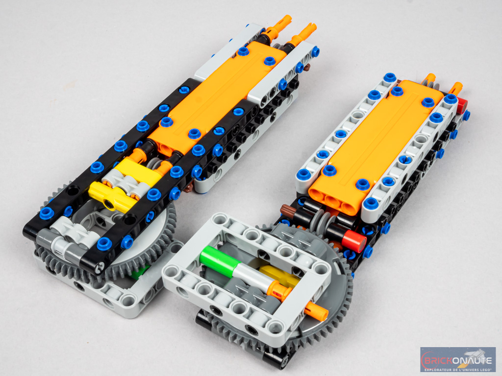 Nous nous occupons ici des « mollets », et nous commençons par leur structure. En partie supérieure, on retrouve une grande turntable – le reste de cette structure étant essentiellement composée d’éléments Technic. Remarquez ici encore un assemblage non démontable dans les cadres – les deux petits beams rouges étant traversés par un pin Technic affleurant.