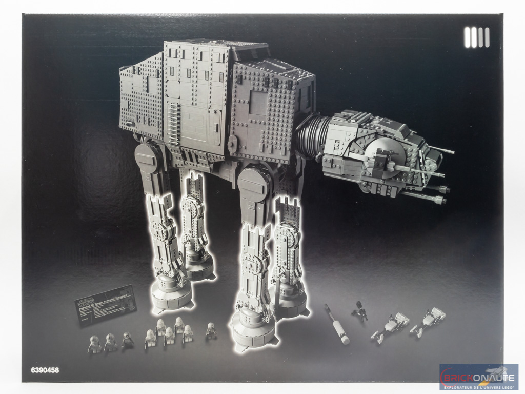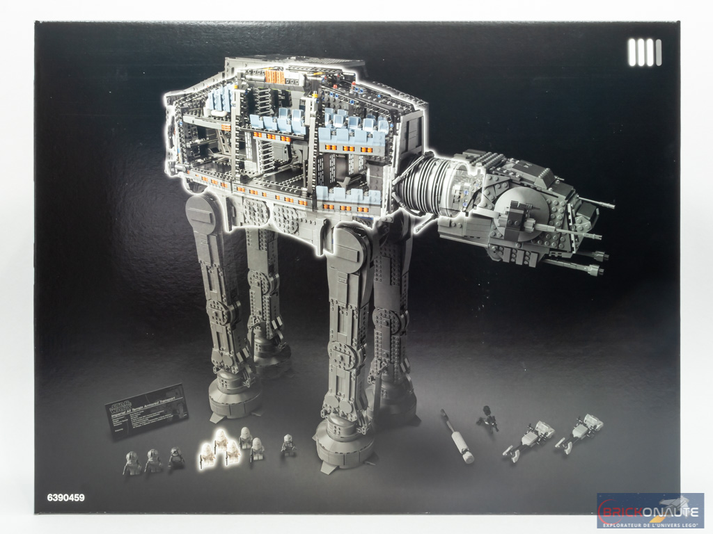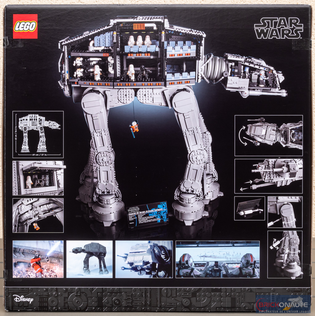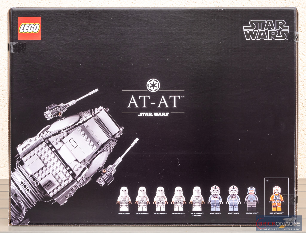 Sur la face supérieure, la tête de la machine dépasse dans un coin – on y trouve surtout un récapitulatif des 9 minifigs présentes : 4 snowtroopers, un snowtrooper commander, deux pilotes d’AT-AT, le général Veers et Luke Skywalker. Les autres faces de la boîte sont sympathiques également : on y voit l’engin depuis l’avant, l’arrière… et le dessous !