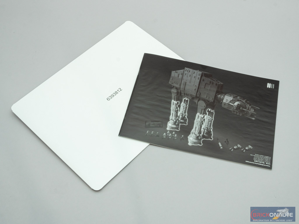 Sur la face avant de la boîte, on retrouve en surbrillance les derniers éléments à assembler : le blindage du corps, la tête, la plaque signalétique et les speeder-bikes. La boîte contient 15 sachets numérotés de 14 à 18 et une grande tile noire qui recevra l’autocollant « signalétique » de notre UCS. La notice, toujours dans une pochette cartonnée, contient 256 pages pour 489 étapes de construction (+ quelques autres pour les constructions « annexes »).