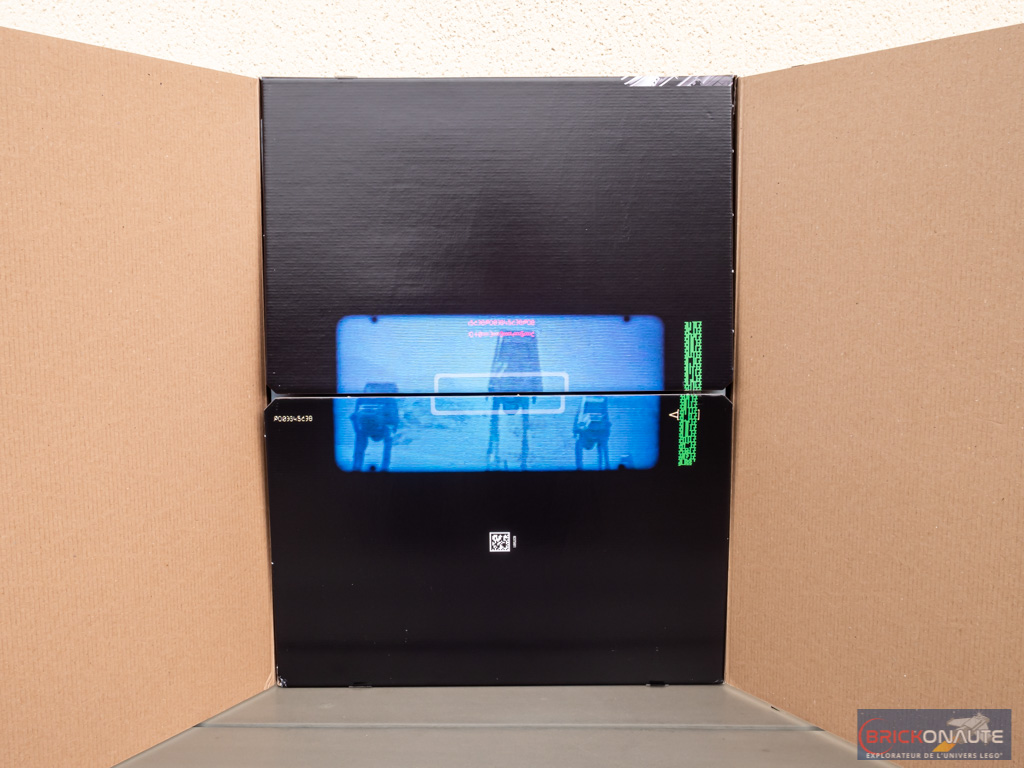 La boîte du Titanic s’ouvrait par le dessus – ici c’est sur le côté que nous découpons quelques scotchs avant d’accéder à l’intérieur. Les deux rabats intérieurs nous montrent les AT-AT vus au travers d’électrojumelles. On trouve 4 « sous-boîtes » numérotées qui, assemblées, forment une image de l’assaut de la base Echo du système Hoth dans L’Empire Contre-Attaque. Seul petit souci : avec la boîte « debout » dans le bon sens, l’image était à l’envers en ouvrant les rabats (j’ai retourné la boîte pour la photo ci-dessous). Je reviendrai sur chacune de ces boîtes et leur contenu dans le chapitre dédié à la construction.