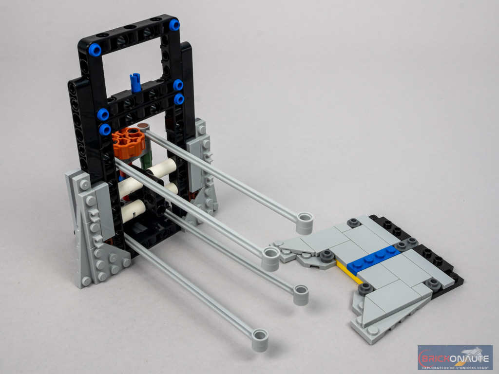 Pour supporter le poids conséquent de la machine, les 4 pattes sont conçues de manière « originale » : elles renferment une structure Technic qui, par l’intermédiaire d’une vis sans fin et d’un engrenage, permettent à l’engin de se tenir debout sans s’écrouler sous son propre poids. Le revers de la médaille, c’est qu’il faut s’armer d’un « tournevis », assemblé au début de la construction, permettant d’ajuster les angles de rotation en tournant la fameuse vis sans fin. Et c’est assez laborieux : le set est plutôt lourd, et il faut évidemment le soulever avant de manoeuvrer les vis. Sans compter qu’il faut trouver l’angle adéquat pour les 4 pattes, certaines positions étant « déconseillées » par LEGO dans le manuel d’instructions. Autant dire qu’on ne changera pas de configuration tous les 4 matins.