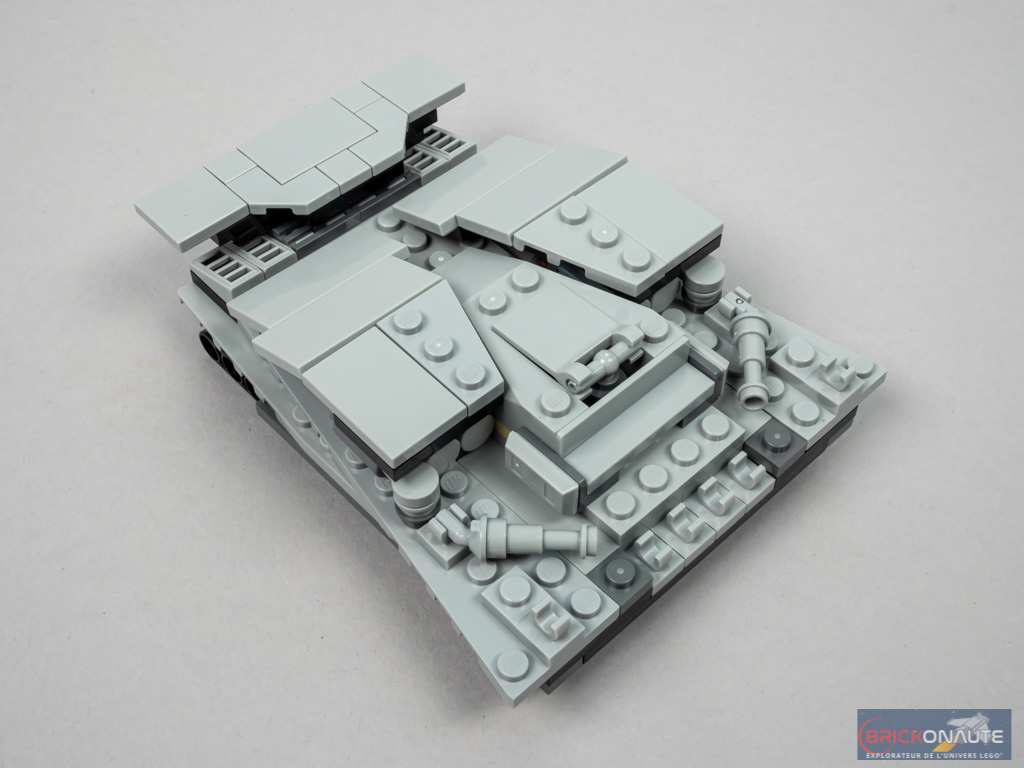 La cabine de pilotage est également bien fichue, avec la possibilité d’accueillir deux pilotes et le général Maximilan Veers. Il est très facile d’accéder à l’intérieur – et donc de profiter de cet aménagement : les panneaux de blindage sont simplement posés et maintenus en place par des axes Technic.
