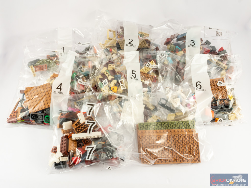 A l’intérieur, nous trouvons 7 sachets de pièces numérotés de 1 à 7, et un 8ème sachet non numéroté. Nous avons également une notice d’instructions de 180 pages pour 262 étapes de construction, et deux planches d’autocollants (22 stickers au total). Certains sont sur un fond transparent : attention aux traces de doigts !