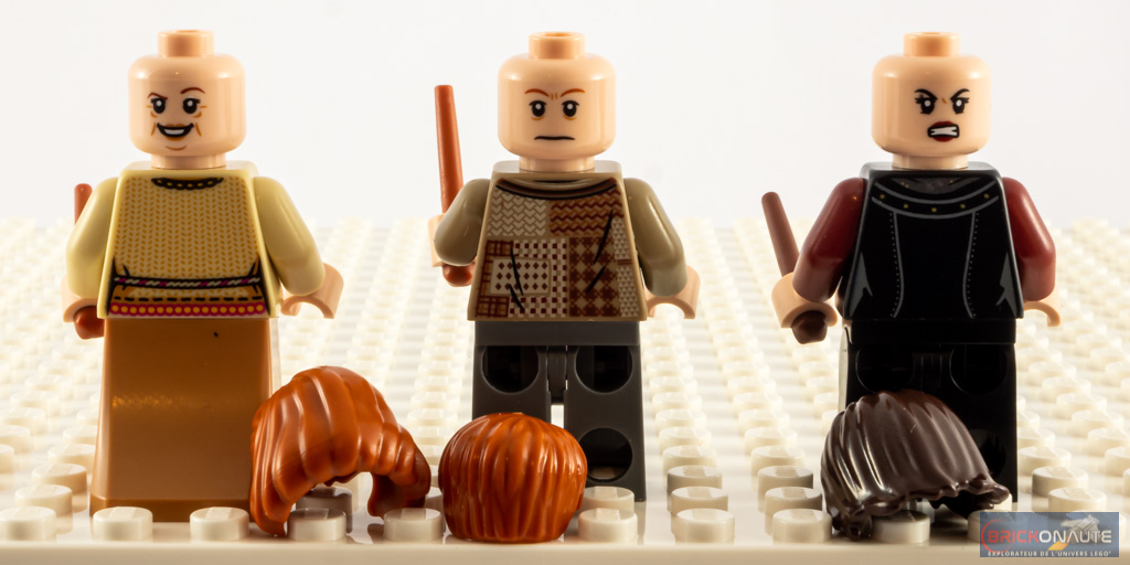 Parmi les 8 minifigs présentes dans la boîte, 6 sont exclusives à cette dernière. Seules les minifigs de Harry et de Ron sont présentes chacune dans un autre set. Et parmi ces 8 minifigs, premier constat : tous disposent d’une expression du visage alternative, et c’est un très bon point. Moins bon point, une seule minifig dispose d’un pantalon tampographié, il s’agit de Fenrir Greyback. Pantalon partagé avec Drago Malefoy ou son père Lucius dans d’autres sets.