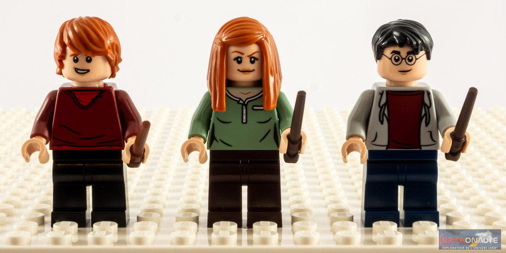Du côté des « gentils », on notera également la présence de 3 élèves de Poudlard : Harry Potter, évidemment, mais également Ron Weasley et sa soeur Ginny. Ginny qui est la seule des trois à être exclusive. Sa tenue reste relativement simple : un haut vert avec quelques plis où l’on aperçoit légèrement la base du cou. Ron et Harry ont déjà été vus dans ces tenues, respectivement dans les sets 75947 Hagrid’s Hut: Buckbeak’s Rescue et 75967 Forbidden Forest: Umbridge’s Encounter. Là encore, les tenues sont plutôt simples et pour le coup pas spécialement fidèles à celles portées par les personnages à cet instant du film.
