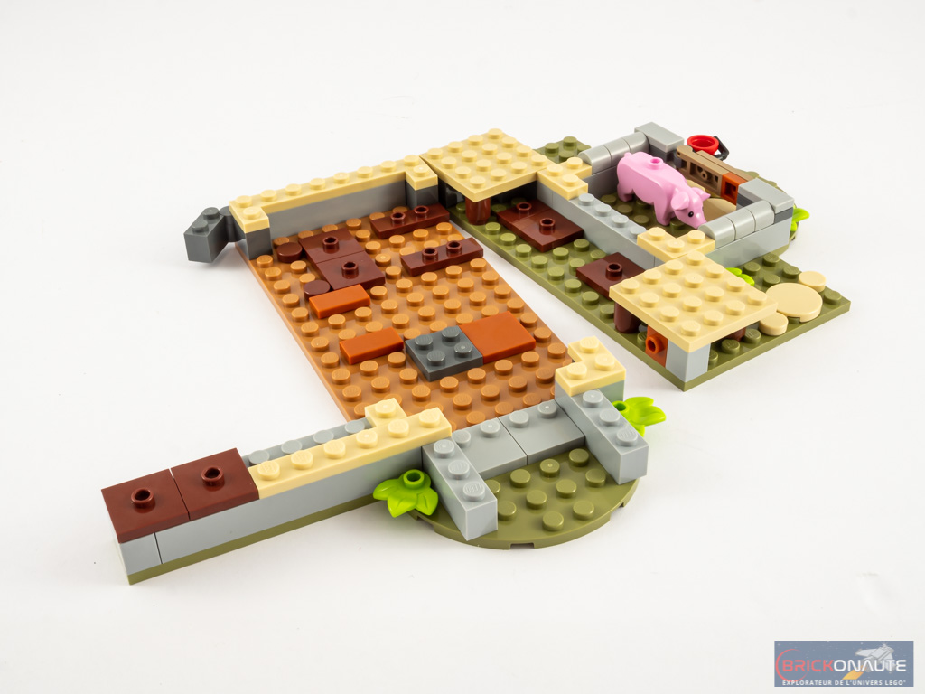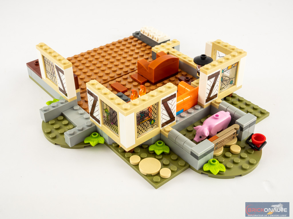 L’assemblage commence par l’enclos du cochon, situé sur le côté de la maison et basé sur une plate de 8×16 tenons couleur olive green. La porte est clipsée et est donc mobile. On ajoute quelques murs, puis nous passons à la deuxième plate que l’on fixe à la première sur une charnière. Sur cette deuxième plate, nous ajoutons quelques meubles et la base des murs. La première étape de construction s’achève avec une troisième plate, elle aussi fixée sur une charnière à la deuxième.