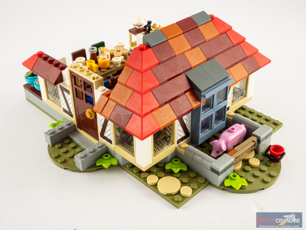 L’assemblage commence par l’enclos du cochon, situé sur le côté de la maison et basé sur une plate de 8×16 tenons couleur olive green. La porte est clipsée et est donc mobile. On ajoute quelques murs, puis nous passons à la deuxième plate que l’on fixe à la première sur une charnière. Sur cette deuxième plate, nous ajoutons quelques meubles et la base des murs. La première étape de construction s’achève avec une troisième plate, elle aussi fixée sur une charnière à la deuxième.
