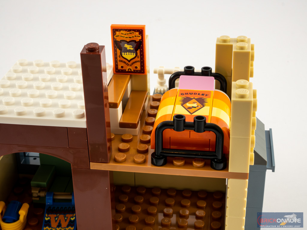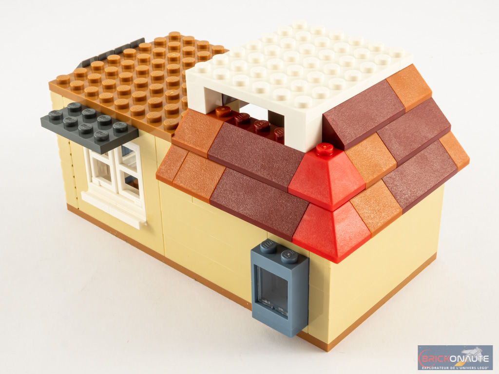 Seul petit regret relatif à l’intégration de la fonctionnalité de la cheminée : un axe Technic traverse le salon et il aurait mérité d’être mieux dissimulé. Mais c’est à mon goût le seul élément de design qui soit gênant : tout le reste est vraiment très bien réalisé. On pourra juger l’aspect coloré un peu « déplacé » par rapport à la maison vue dans le film, mais rappelons-nous qu’il s’agit d’un jouet. La forme biscornue de la maison, ses toitures inégales et ses éléments qui semblent avoir été posés les uns au-dessus des autres – c’est franchement réussi. Comme je le disais un peu plus haut, l’intérieur est également sublime, au détriment de l’espace disponible notamment dans les chambres. Mais sur un aspect purement design, il n’y a rien à dire.
