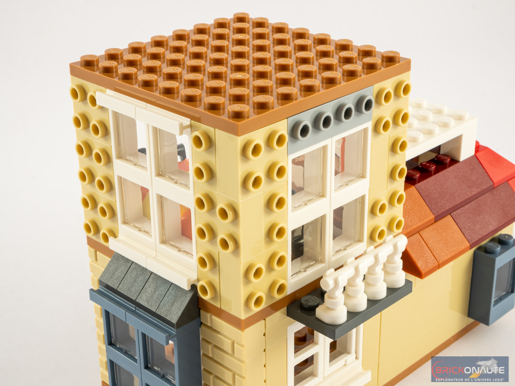 J’ai vraiment pris du plaisir à construire ce set, on ne voit vraiment pas passer les 3 petites heures nécessaires à son assemblage. Les étapes sont variées, alternant murs, mobilier et toiture, le tout ponctué de « techniques » de construction intéressante. Mention spéciale pour la réalisation de la bibliothèque au rez-de-chaussée, et pour la manière d’incliner la partie haute de la maison tout en garantissant sa stabilité. Je suis (presque) prêt à pardonner les autocollants, relativement faciles à appliquer ici.