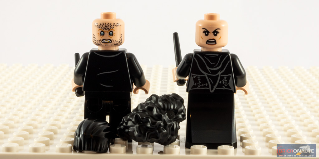 Parmi les 8 minifigs présentes dans la boîte, 6 sont exclusives à cette dernière. Seules les minifigs de Harry et de Ron sont présentes chacune dans un autre set. Et parmi ces 8 minifigs, premier constat : tous disposent d’une expression du visage alternative, et c’est un très bon point. Moins bon point, une seule minifig dispose d’un pantalon tampographié, il s’agit de Fenrir Greyback. Pantalon partagé avec Drago Malefoy ou son père Lucius dans d’autres sets.
