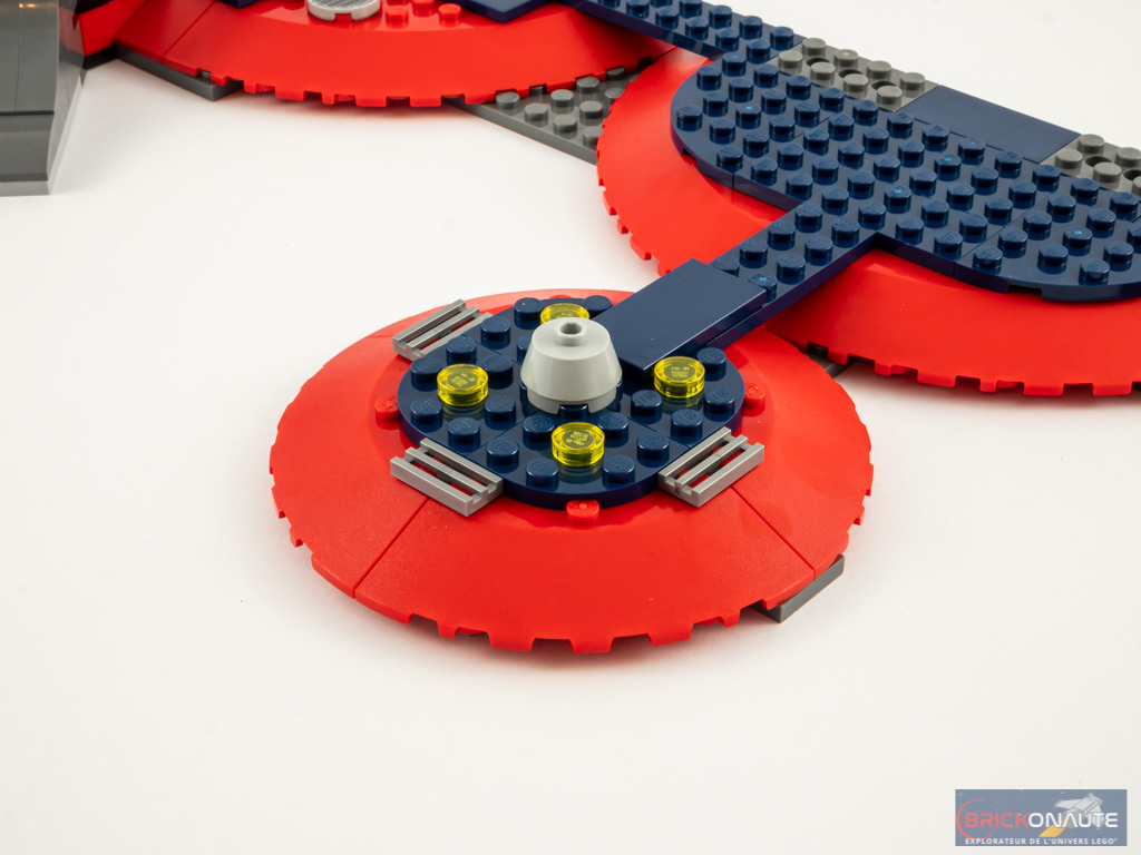 Pour un set dédié aux adultes, on serait en mesure d’exiger un design soigné pour exposer dignement les jolies minifigs. Et force est de constater que ce n’est pas vraiment le cas non plus. C’est un peu fourre-tout, entre les écrans, la prison et le présentoir à minifigs. Les couleurs dominantes, celles de la combinaison de Spider-Man, sont bien choisies mais c’est à peu près le seul point positif que je trouve. Même les deux véhicules, qui auraient pu permettre de proposer quelque-chose d’original, sont finalement très moyens. La moto… est une moto, et l’engin volant est bien trop simple pour être intéressant.