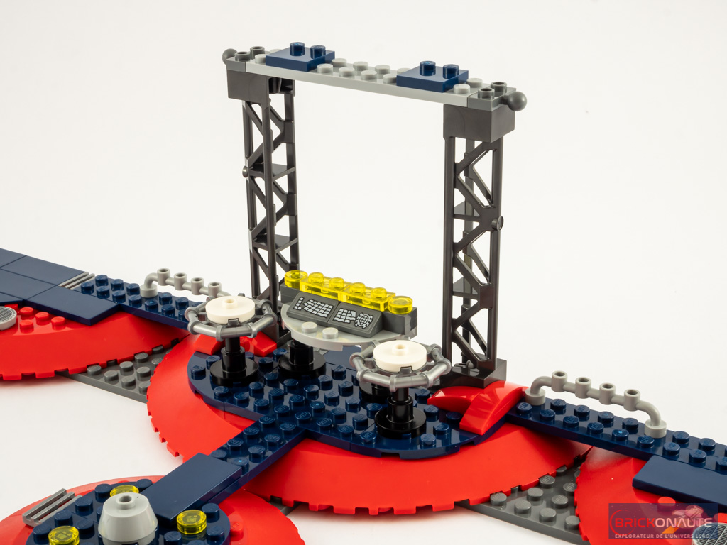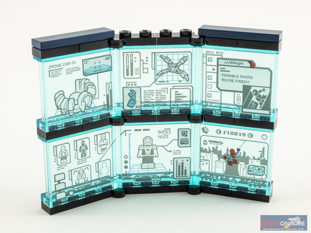 Avec le sachet suivant, nous allons nous concentrer sur la partie centrale avec, pour commencer, une avancée circulaire qui servira de support à la moto. Elle est réalisée de la même manière que le reste du socle. On construit ensuite un bureau avec quelques commandes, deux guéridons et un portique. Les écrans de contrôle sont assemblés ensuite. Ils sont reliés les uns aux autres avec des charnières et revêtent tous un autocollant transparent. Attention aux traces de doigt ! On termine cette étape avec la décoration du portique : sur sa partie supérieure avec un masque de Spider-Man stylisé, et sur les côtés avec deux spots et des toiles d’araignée.