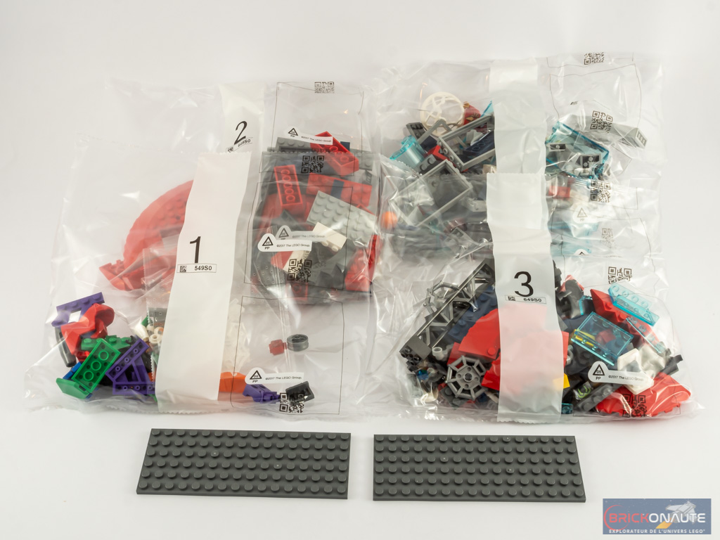 A l’intérieur, nous trouvons 4 sachets de pièces numérotés et deux plates couleur dark bluish gray. La notice d’instructions compte 116 pages pour 135 étapes, et LEGO fournit également une planche de 13 autocollants.