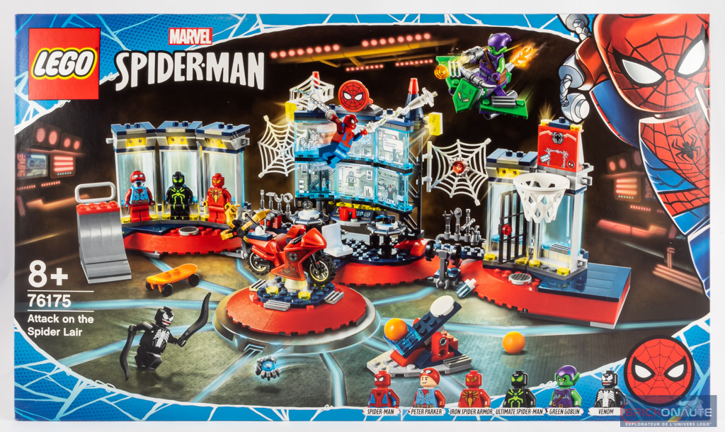 La boîte reprend les « codes » des sets dédiés à l’homme-araignée, le set nous étant présenté au travers d’une toile d’araignée sur fond bleu de laquelle s’échappe Spider-Man. On y voit une petite mise en scène, Venom et le Bouffon Vert (Green Goblin) s’attaquant au repaire de Spidey. La mise en scène est assez similaire au dos de la boîte, qui nous présente également des zooms sur quelques détails.