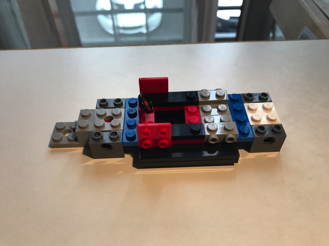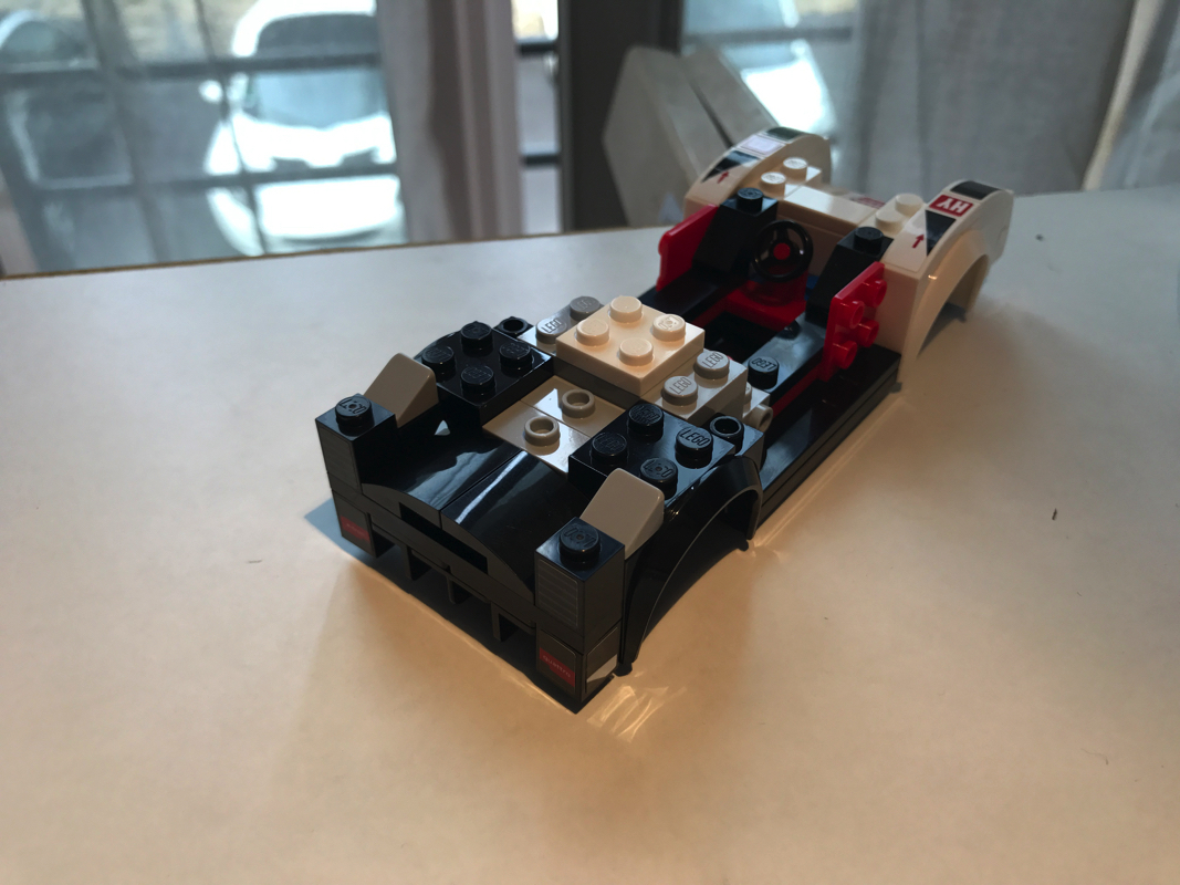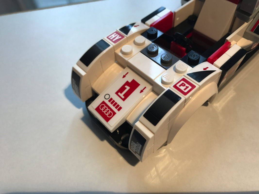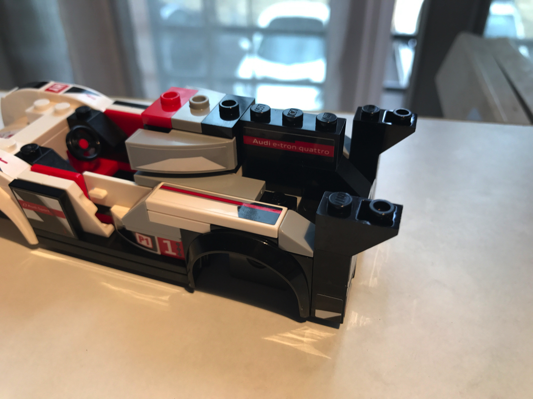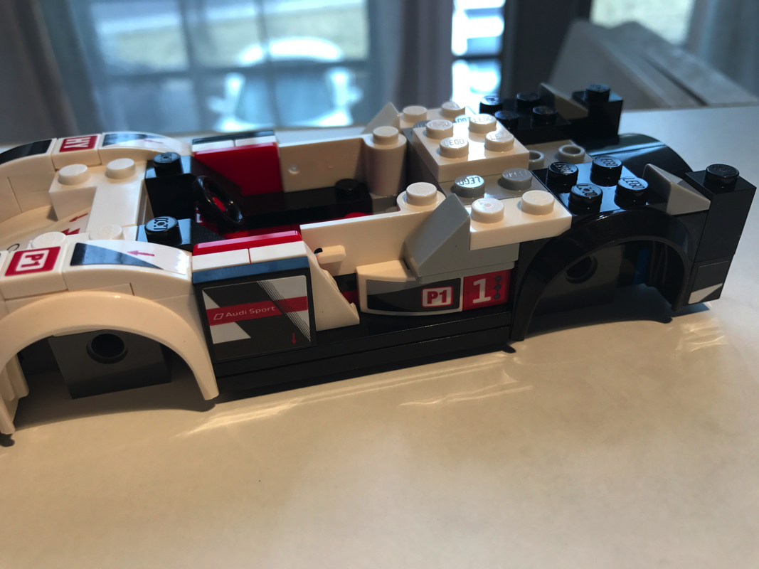 On assemble ensuite logiquement la voiture. On commence par le châssis, puis l’avant et l’arrirèe de véhicule (bardés de stickers), avant de s’attaquer à la partie centrale contenant le moteur et l’aileron. Les courbes, les petites poignées de porte, le cockpit qui fait son petit effet sont dans l’ensemble bien réussis, mais l’assemblage est « entaché » par l’application de la myriade de stickers, parfois difficiles à centrer, et dont le blanc tranche avec celui des pièces LEGO ce qui est plutôt gênant.