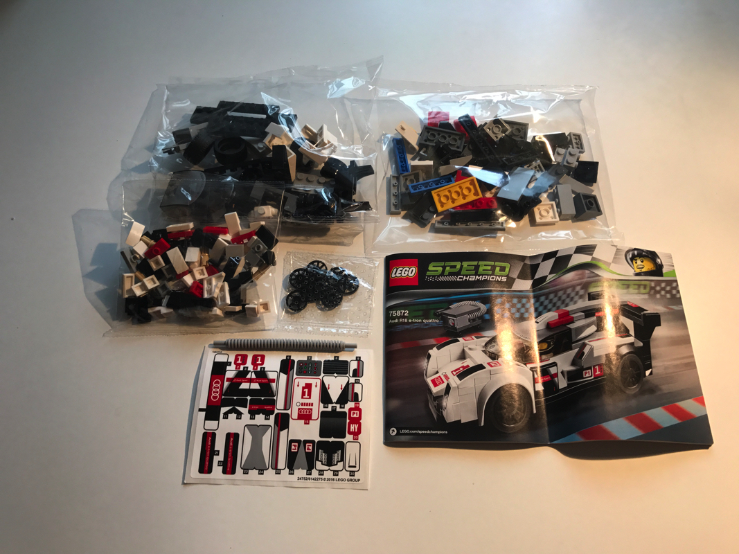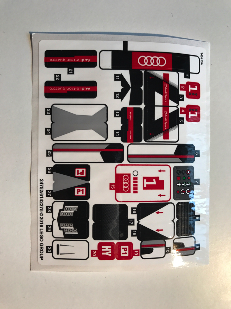 Les dimensions de la boîte sont celles qu’on a l’habitude de retrouver dans cette gamme. On retrouve sur l’avant le modèle construit, et le logo Audi, que l’on retrouve également sur l’arrière, accompagné de 3 photos du modèle, et d’une de la voiture originale. A l’intérieur, une planche de 32 (!) stickers, 4 sachets non numérotés, un flexible en light bluish gray et la notice d’instructions.