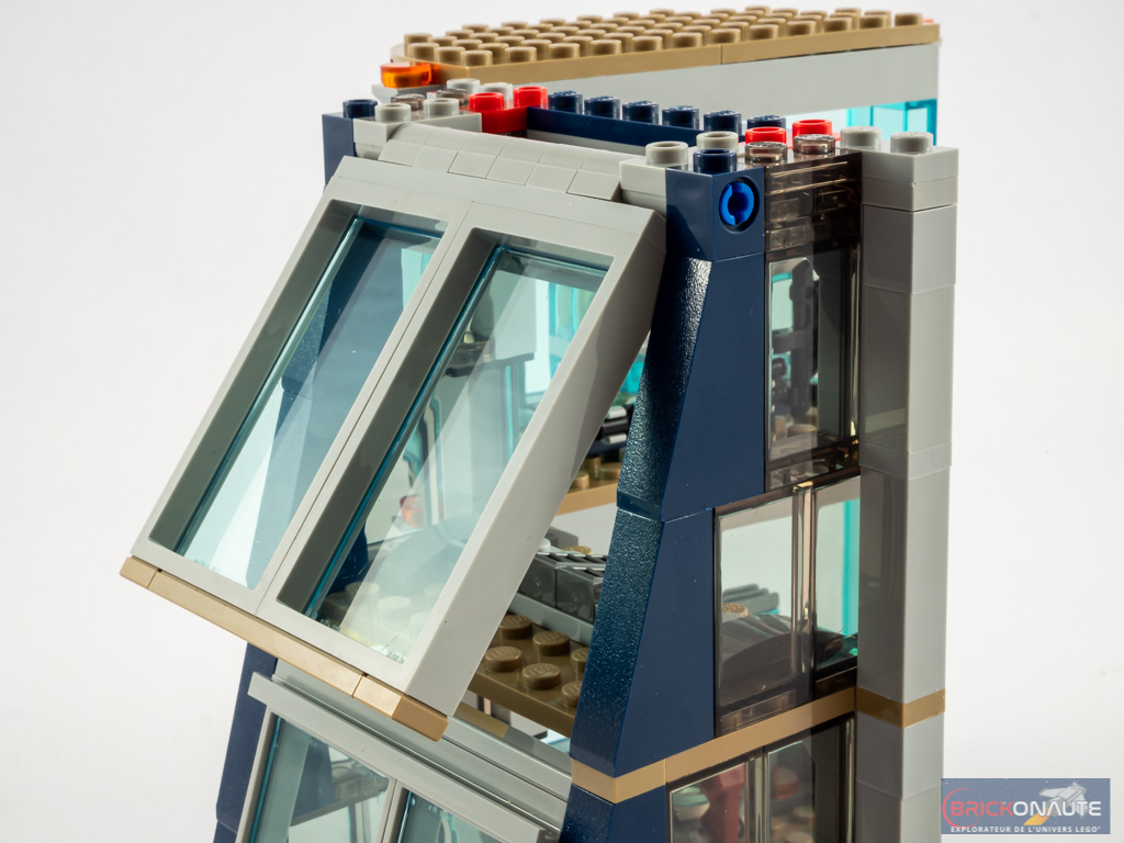 On s’occupe ensuite de l’autre côté sur le même principe, si ce n’est que toutes les vitres sont verticales, et incurvées pour certaines. A l’intérieur, on crée un petit mécanisme visant à faire « exploser » l’ARC Reactor. On termine cette seconde étape avec le plancher du 1er étage, sur ce deuxième côté.
