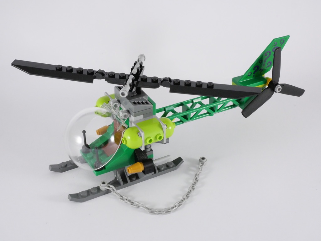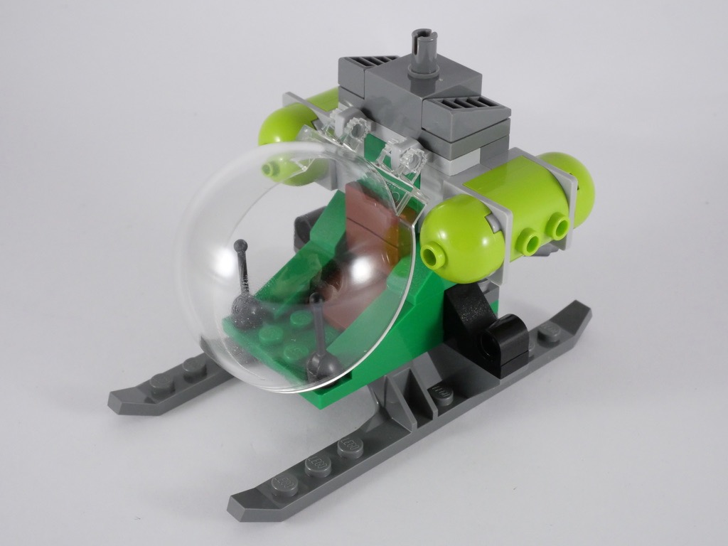 Le cockpit terminé, on ajoute la queue et son aileron décoré de points d’interrogation, qui dispose d’une petite hélice. Elle est fixée sur un axe jaune, qui reste malheureusement en partie visible. On termine avec les pales de l’hélicoptère. Comme souvent avec cette couleur lime, j’ai remarqué ici une légère différence de teinte entre certaines pièces, qui ne doivent pas sortir de la même usine : c’est dommage.