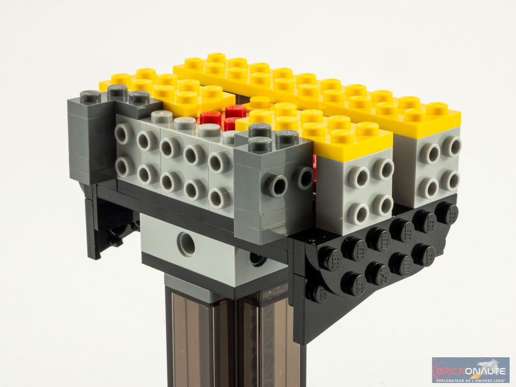Comme d’habitude, la construction commence par le socle d’exposition. La structure interne de celui-ci est renforcée par deux beams fixés sur des cadres Technic aux deux extrémités. Petite variation par rapport à d’habitude : le « pilier » central du socle est composé de pièces en trans black plutôt que noires, ça change et c’est intéressant.