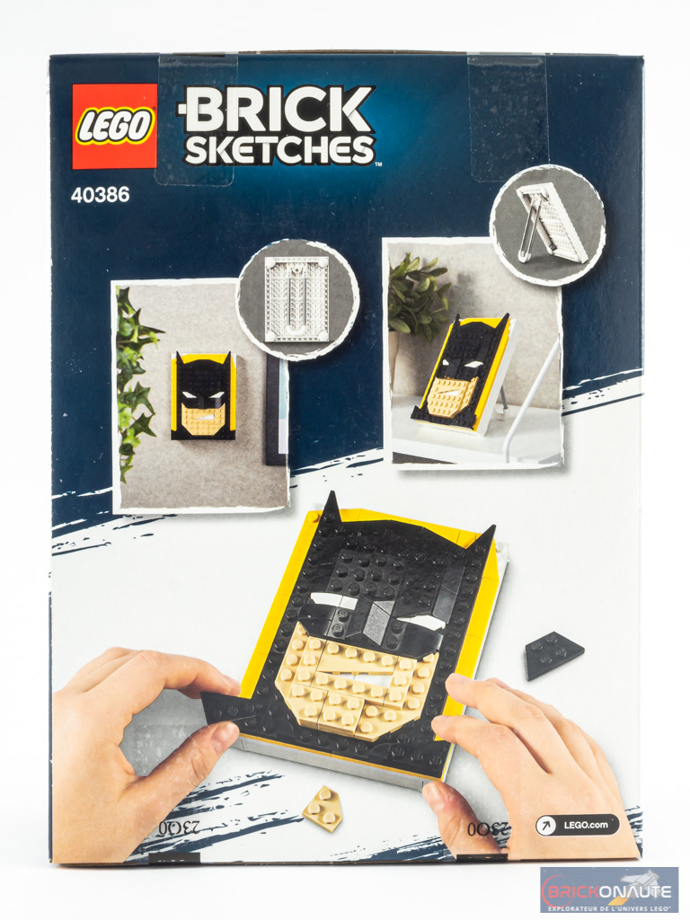 Sur la face avant, notre set nous est présenté sur un fond bleu sur lequel on aurait passé un coup de pinceau blanc. On retrouve les logos DC et Batman en partie inférieure. Au dos, deux vignettes nous montrent que l’on peut, au choix, accrocher le set au mur ou le disposer sur un chevalet intégré. Une dernière photo nous montre la construction sur le point d’être achevée, avec deux pièces posées à côté. et une troisième dans la main gauche du constructeur.