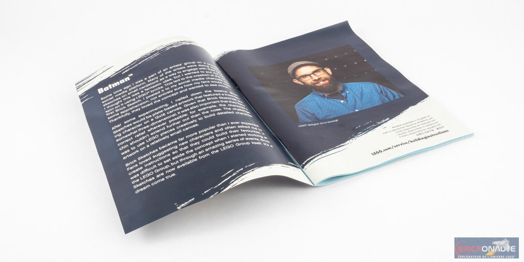 A l’intérieur, nous trouvons 3 sachets de pièces non numérotés, deux briques blanches 1×16 et une notice d’instructions de 48 pages pour 41 étapes de construction. Hormis deux Plate 2X2, Corner, 45 Deg. en tan, on ne trouve pas de pièces spécialement rares dans les 115 éléments qui composent l’inventaire de ce set. A l’intérieur de la notice, un petit mot de Chris McVeigh nous en dit plus sur la genèse de son concept initial « d’esquisses » en LEGO.
