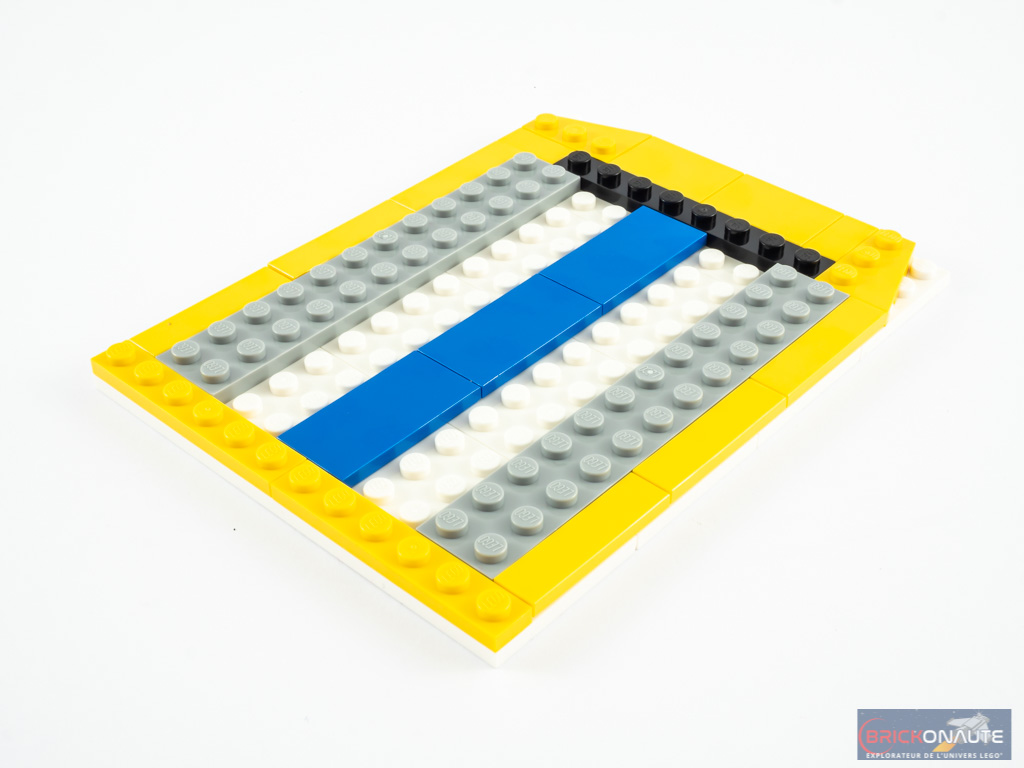 La construction est plutôt rapide : les 115 pièces sont ainsi assemblées en un petit quart d’heure. Il s’agit d’une construction par couches : une base blanche, de 12×16 tenons, sur laquelle on attache des plates de différentes dimensions et couleurs les unes au-dessus des autres.
