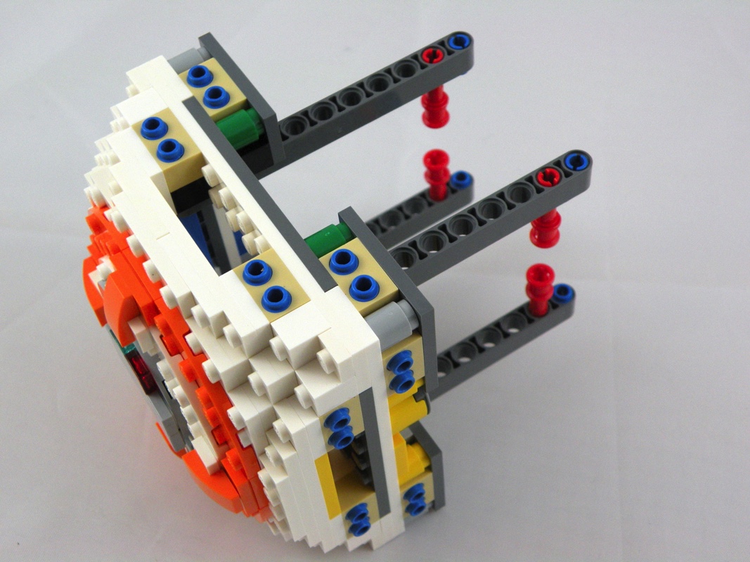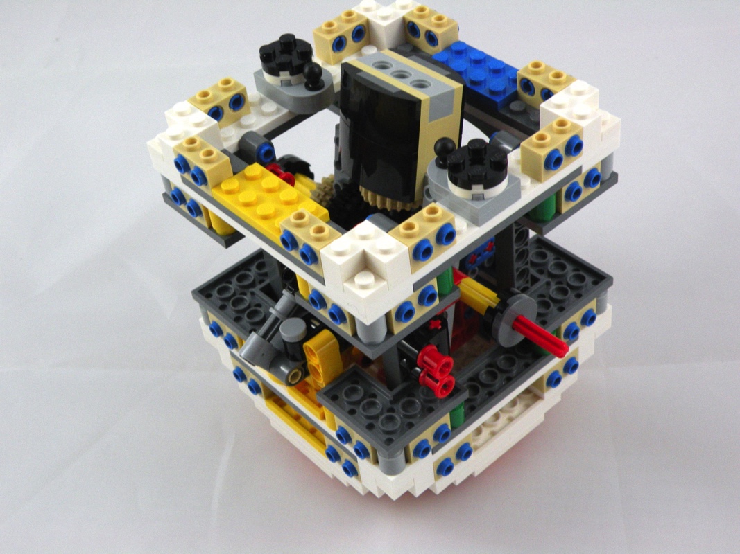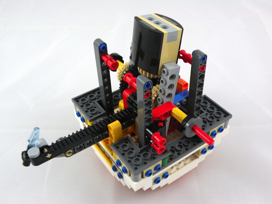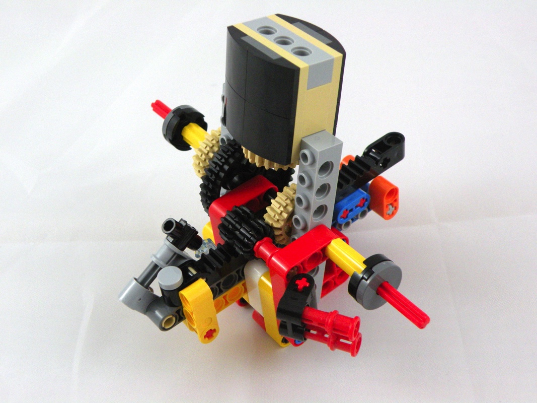 On commence par assembler le bas de celui-ci, avant de s’attaquer au mécanisme intérieur qui servira à faire tourner la tête et à sortir le chalumeau. Cette seconde étape tranche avec le reste, puisqu’elle se compose essentiellement de pièces Technic. Ca change, et ça fait plaisir.