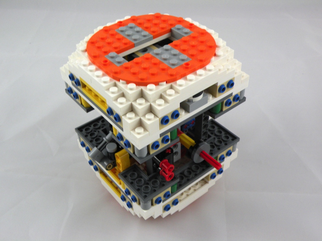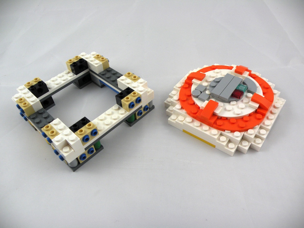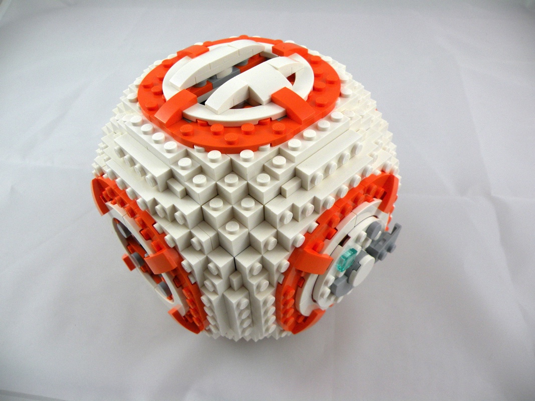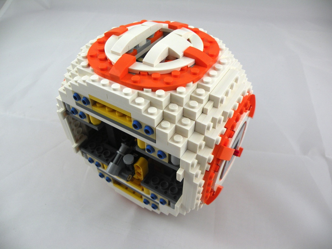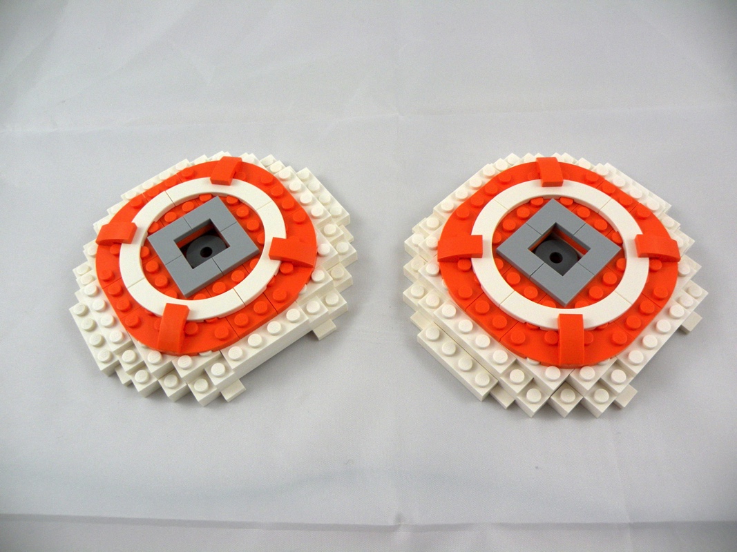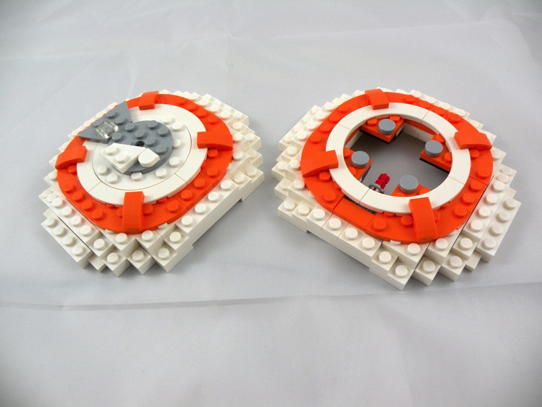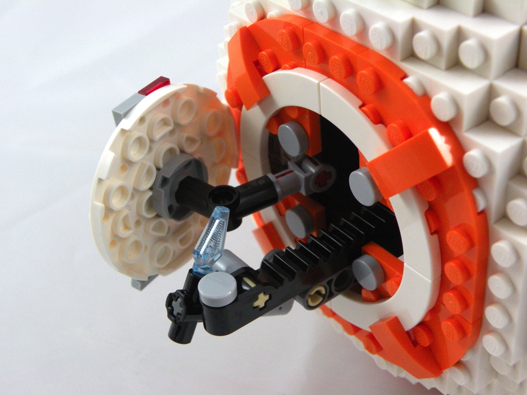Les étapes suivants consistent à habiller les 5 autres faces du robot. En effet, notre BB-8 a beau être en forme de boule, la base sur laquelle viennent se fixer les différents habillages est un cube. Ces habillages sont constitués de plates posées les unes sur les autres, afin de transformer notre cube… en boule 😉 On ajoute des tiles près du centre afin de pouvoir actionner les différents mécanismes. Petite fantaisie, une porte mobile prend place sur un des côtés, là où sort le chalumeau. C’est malheureusement plutôt répétitif, mais le résultat est à la hauteur des espérances, de toute beauté.