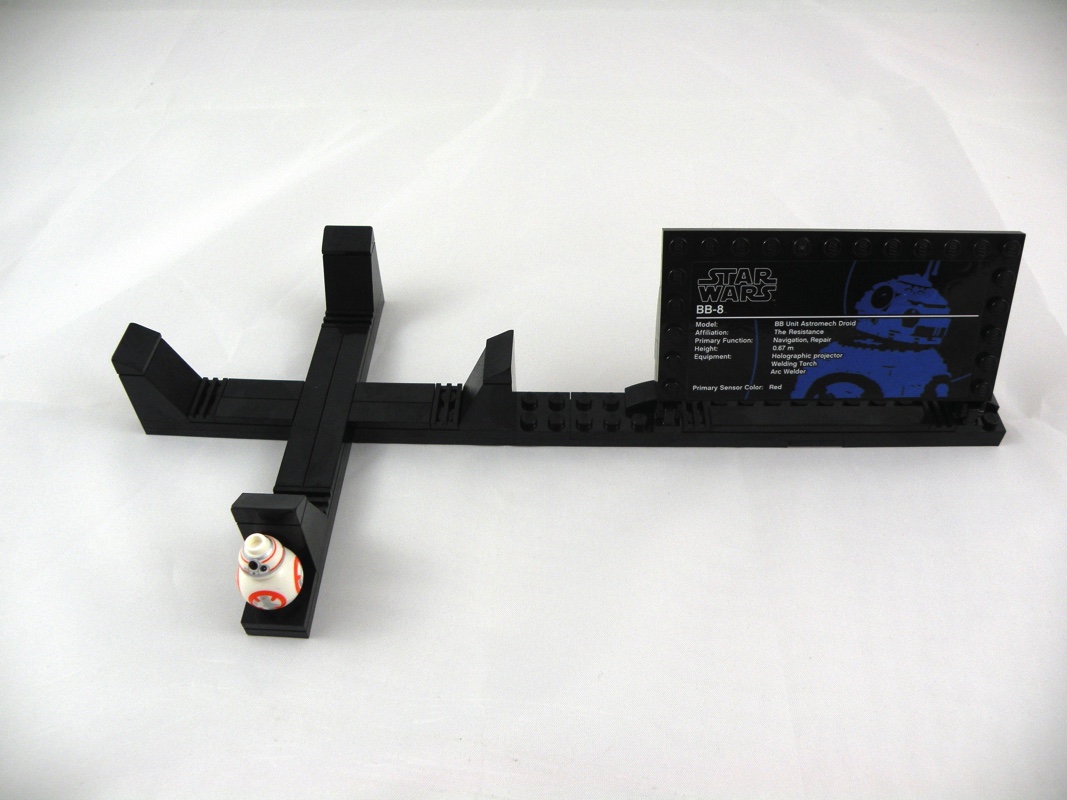 Ne reste plus maintenant qu’à assembler le socle qui va recevoir le robot, avec une conception qui permet de faire reposer celui-ci sur 4 slopes. Il n’est donc pas fixé, et on choisira d’exposer la face qui nous plaît le plus. On y ajoute la plaque signalétique (avec la phase fatidique de collage du sticker sur celle-ci), ainsi que la minifig, identique à celle que l’on trouve dans d’autres sets (et notamment dans le tout nouveau 75176 – Resistance Transport Pod ). Elle est jolie, mais somme toute assez accessoire.