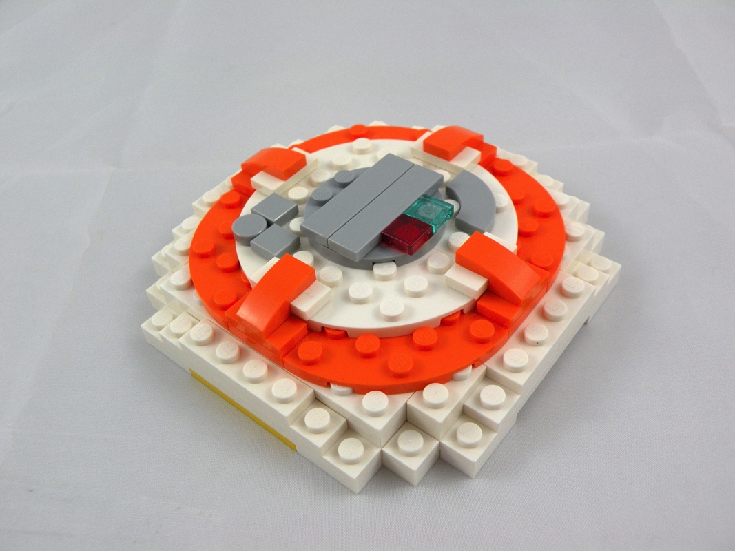 Les étapes suivants consistent à habiller les 5 autres faces du robot. En effet, notre BB-8 a beau être en forme de boule, la base sur laquelle viennent se fixer les différents habillages est un cube. Ces habillages sont constitués de plates posées les unes sur les autres, afin de transformer notre cube… en boule 😉 On ajoute des tiles près du centre afin de pouvoir actionner les différents mécanismes. Petite fantaisie, une porte mobile prend place sur un des côtés, là où sort le chalumeau. C’est malheureusement plutôt répétitif, mais le résultat est à la hauteur des espérances, de toute beauté.