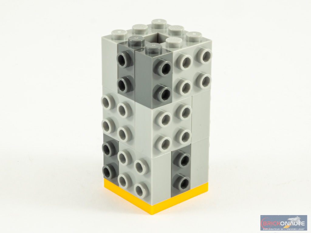 On enchaîne avec Kevin, premier des deux Minions. La structure interne mesure 3×3 tenons, comme les autres Minions à l’exception d’Otto, plus corpulent. Mais elle est un peu plus haute que d’habitude : la principale caractéristique de Kevin étant sa grande taille. La tenue de Kung Fu, de couleur orange, est représentée par une tile tampographiée sur le torse, et deux autres sur les « bras » – reprenant la bande noire vue sur les minifigs des autres sets de la gamme LEGO Minions. Les yeux sont représentés par les mêmes round tiles tampographiées que celles des autres Minions. On termine avec le mini-cerveau, le nunchaku, et le support d’exposition.