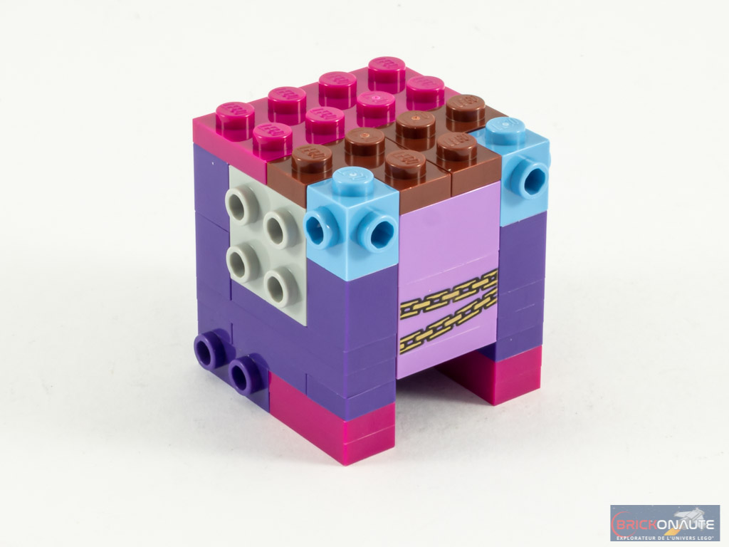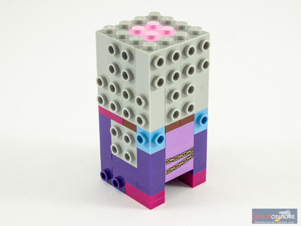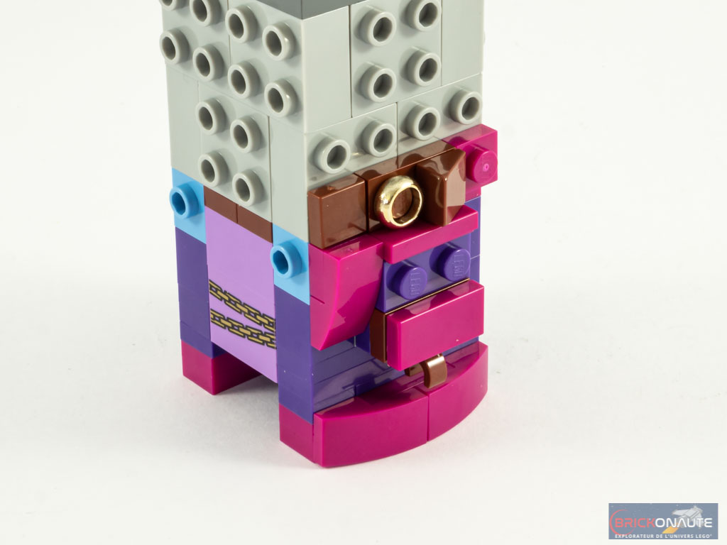 La construction de Belle Bottom commence par la réalisation d’un torse plus grand que d’habitude et pour cause : elle porte une robe, qui descend jusqu’à ses chevilles. La structure interne de la tête est identique à ce que nous trouvons d’habitude dans la gamme, avec 12 briques SNOT et une brique rose en guise de cerveau. Les éléments SNOT du torse reçoivent alors des pièces couleurs Bright Reddish Violet (ou Magenta chez Bricklink) pour représenter la fourrure portée par le personnage. On ajoute les joues et, à l’arrière de celles-ci, la partie basse des oreilles (le reste étant caché par la chevelure dense). Une boucle d’oreille représentée par un anneau servant habituellement d’alliance est apposé juste devant celles-ci.
