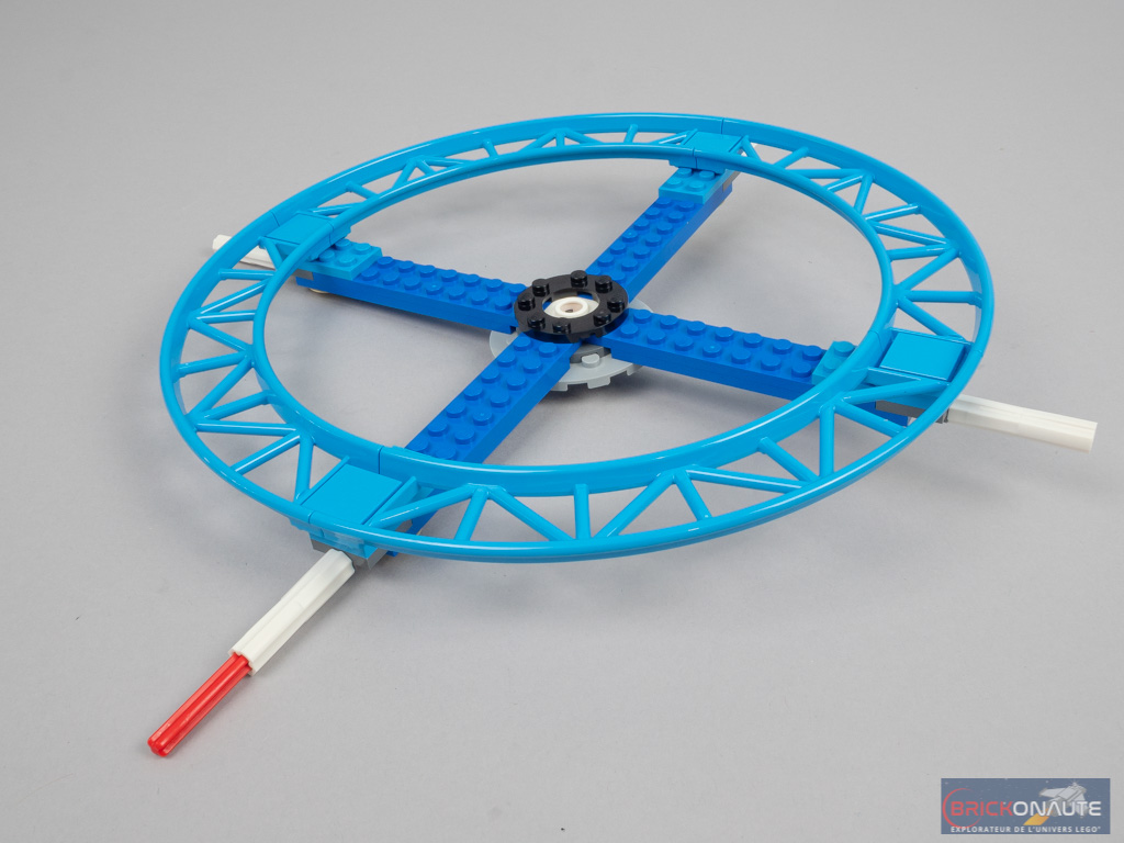 On attache à cet ensemble 4 plateformes formant une croix, avec un ball joint sur la plateforme centrale. Puis on construit le dispositif supportant les rails, en forme de croix également. Sur l’une des branches, un axe vient coulisser entre les grandes briques bleues translucides. Au centre, on le fixe sur le ball joint de la base. Pour le manipuler, on se servira des 3 poignées blanches.