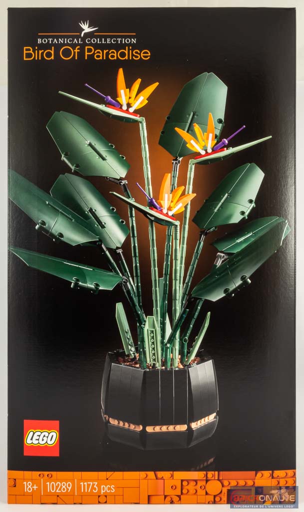 La boîte reprend le schéma déjà vu pour les autres sets de la Botanical Collection : la livrée noire des sets « 18+ » et une jolie photo du set sur celle-ci. Au dos, on trouve une autre vue de la plante avec un gros plan sur les fleurs. Un petit schéma nous précise les dimensions du set une fois terminé : 46cm de haut tout de même. Quelques vignettes complètent l’ensemble avec une photo de la vraie fleur, deux photos de détails, et une photo lifestyle du set.
