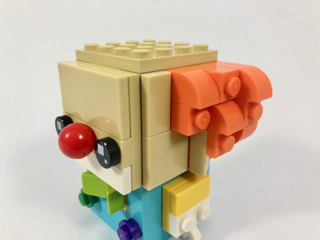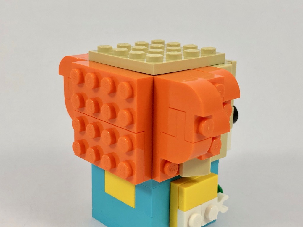 L’expérience de construction est très classique, du moins si vous êtes un habitué de la gamme LEGO BrickHeadz. Pas de technique révolutionnaire à signaler, on remarquera seulement l’utilisation intelligente des pièces oranges dans la constitution de la chevelure.