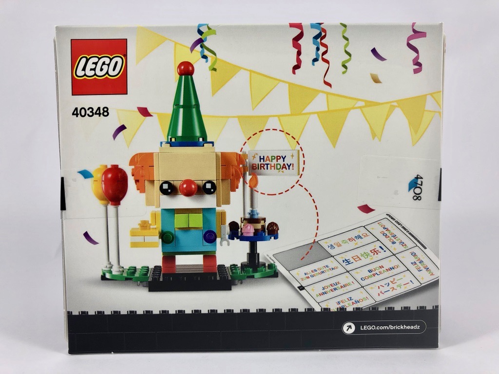 Nous retrouvons une boîte au format habituel des BrickHeadz saisonnières. On notera que c’est un scotch qui la maintient fermée, à la manière des « gros » sets. Au moins, on peut ouvrir la boîte proprement. Sur la face avant, le clown est représenté sans son socle d’exposition, mais avec les deux éléments de décor qui l’accompagnent. On aperçoit quelques cotillons dans le fond. Il porte le numéro 92 dans la série des BrickHeadz. Au dos, nous le trouvons sur son socle, avec un zoom sur la planche d’autocollants fournie : elle permet d’écrire « bon anniversaire » dans 10 langues différentes.