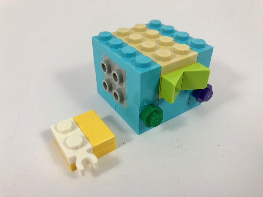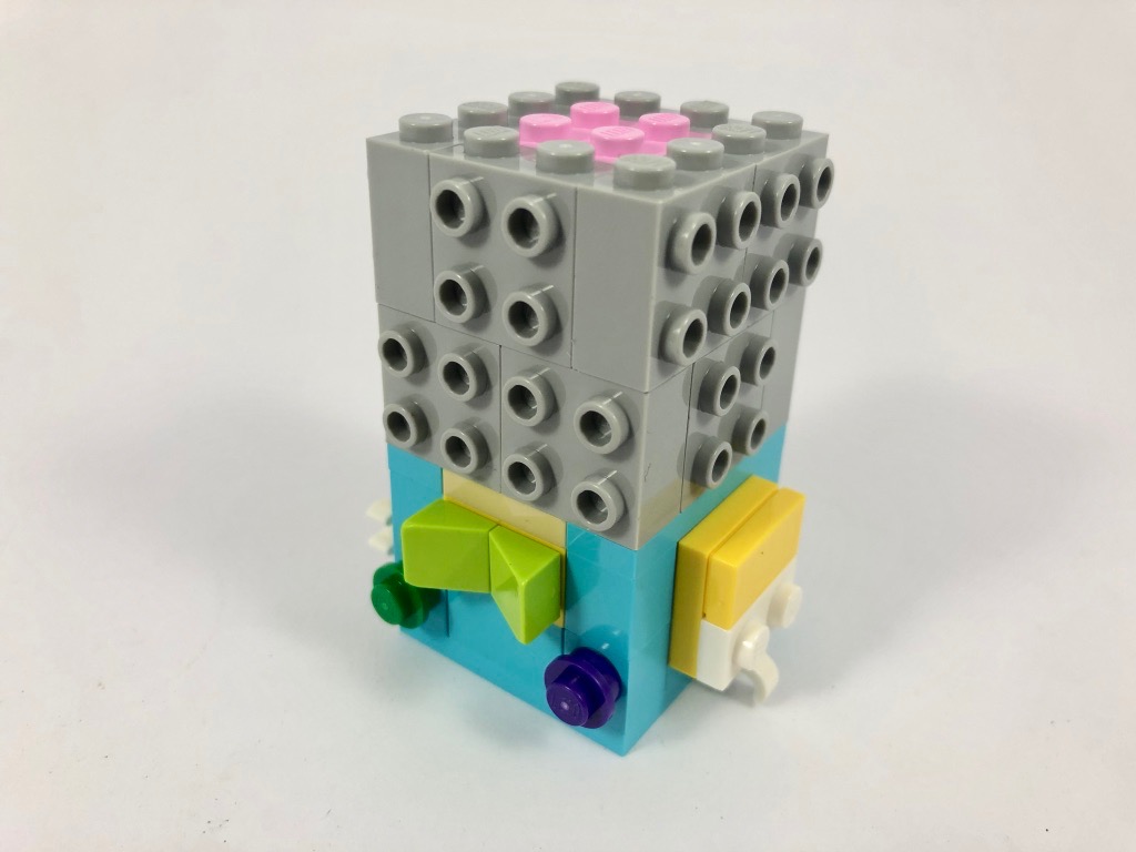 La construction est plutôt classique, si vous êtes un adepte de la gamme LEGO BrickHeadz. On commence par le torse, où deux round plates font office de boutons, tandis que deux cheese slopes représentent le noeud papillon. Une plate couleur tan permet de représenter le cou. La structure interne de la tête est constituée des 12 briques SNOT (pour Studs Not On Top : les tenons sont sur le côté) habituelles, et on retrouve également le cerveau rose.