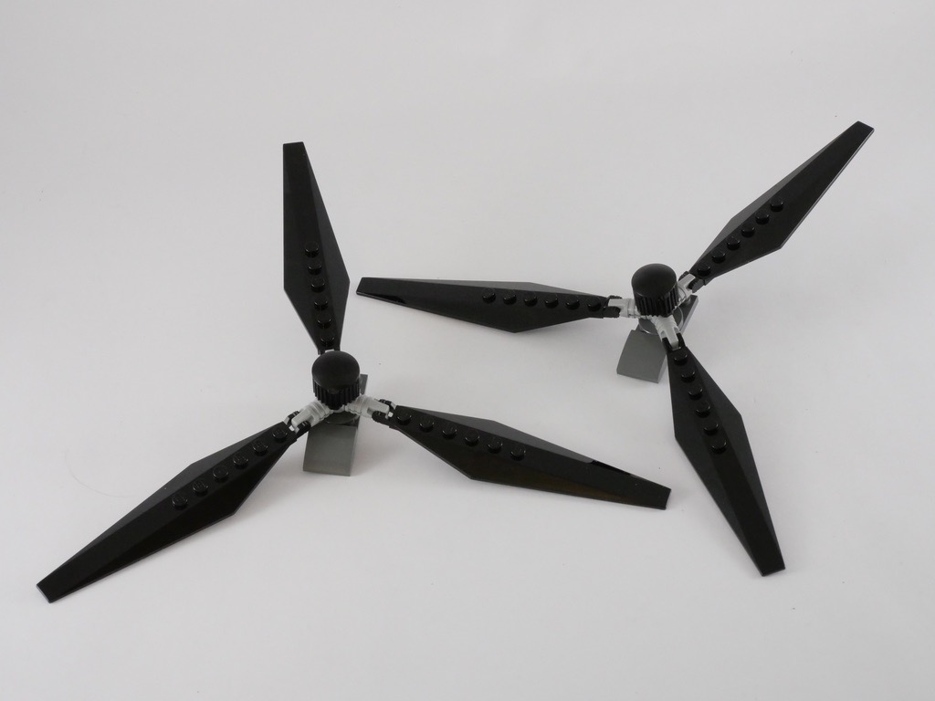 Nous terminons notre hélicoptère en lui ajoutant ses deux rotors. La construction s’achève avec le mini-quad que l’on peut placer dans la soute. Sa forme, un peu étrange, est due à l’espace réduit disponible : il ne rentre pas complètement dans le « corps » de l’hélicoptère mais reste sur la rampe une fois celle-ci refermée.