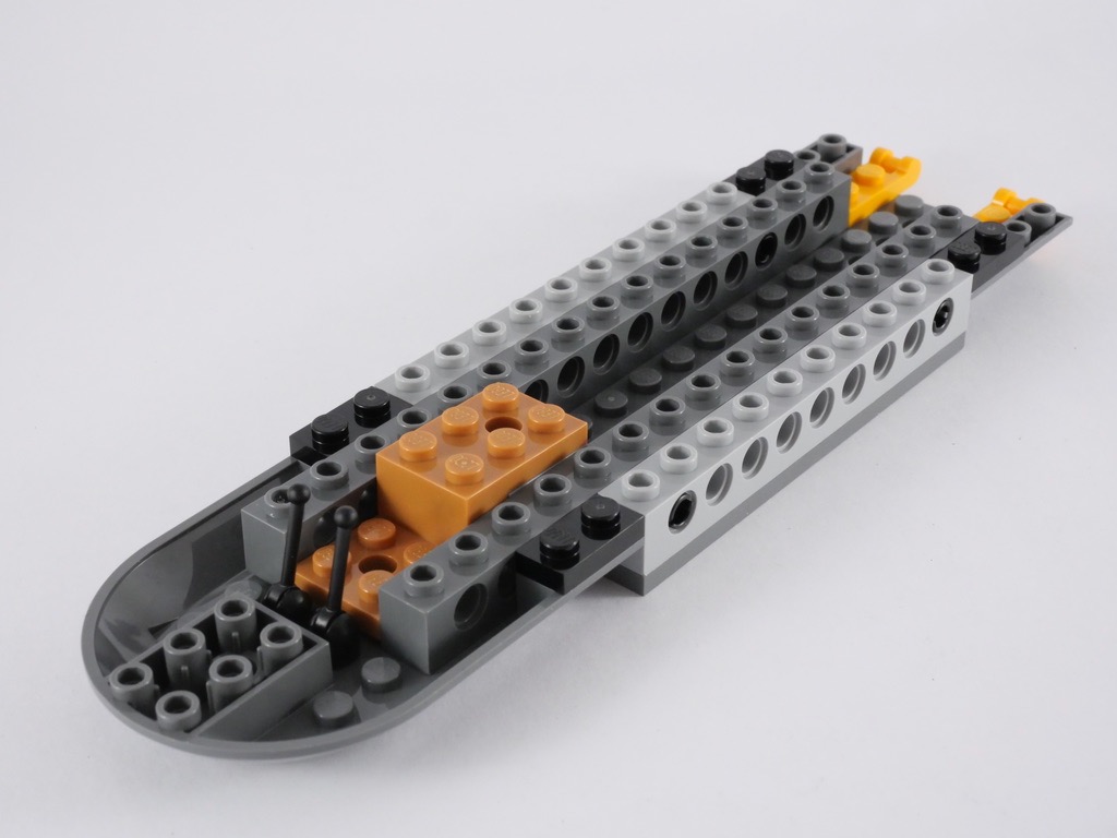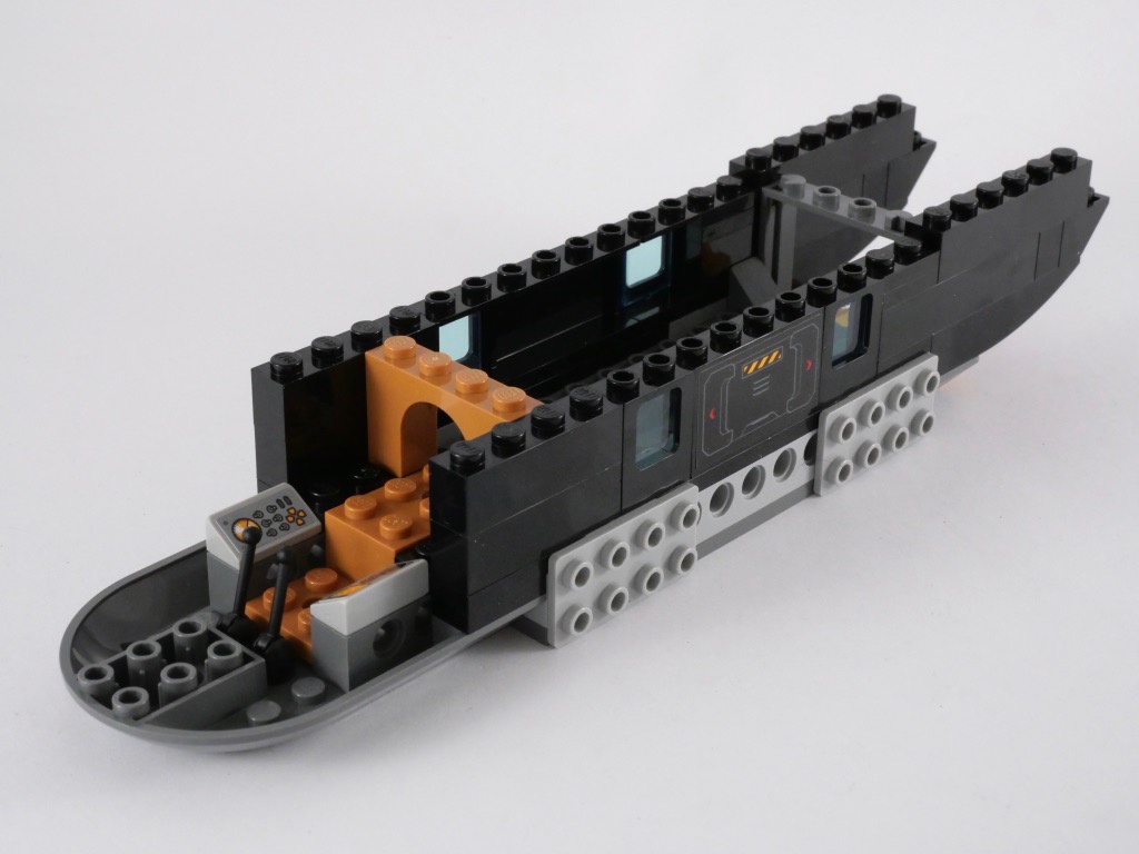 Nous passons ensuite au vif du sujet avec l’hélicoptère. Sa structure est constituée de pièces Technic, on la rallonge de part et d’autre pour le cockpit et la soute. Le cockpit se limite à deux manettes, et deux slopes décorées d’un autocollant. Nous nous concentrons ensuite sur l’arrière de l’engin, un empilement de briques noires assez simple avec quelques fenêtres. A la manière des bâtiments modulaires, la partie supérieure dispose de peu de tenons pour pouvoir accéder facilement à l’intérieur. Nous terminons le 1er sachet de pièces en ajoutant des demi-cylindres gris, sur les deux côtés, et 4 stud-shooters.