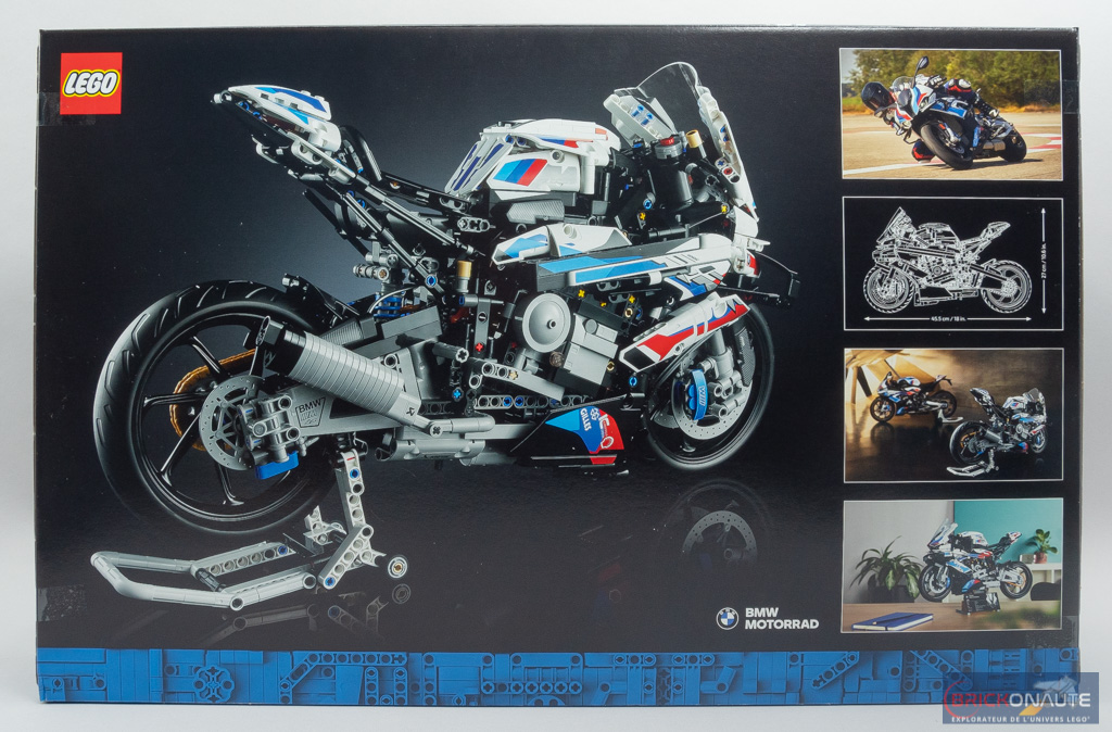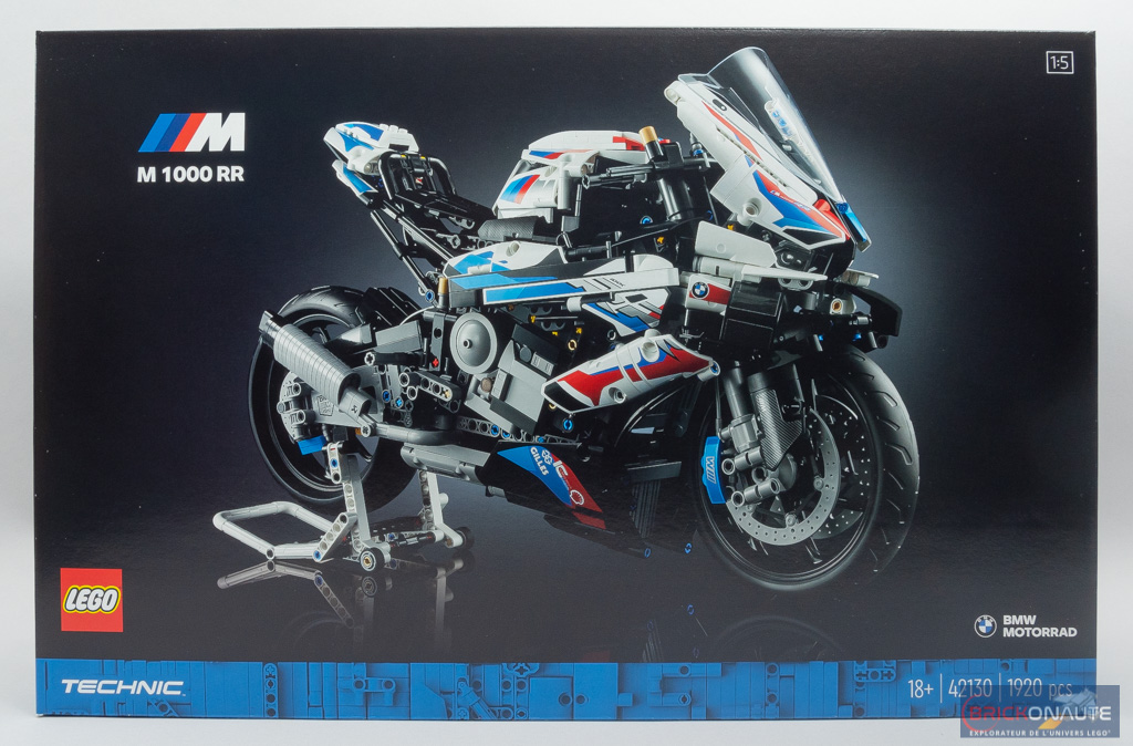 LEGO a déjà proposé, par le passé, quelques modèles de moto dans la gamme LEGO Technic. Le plus récent sous licence d’un constructeur étant le set 42123 Ducati Panigale V4R (646 pièces – 59,99 €). Mais on change de dimension avec le modèle que je vais vous présenter aujourd’hui. LEGO s’est en effet associé à BMW pour nous proposer un modèle hors normes : réalisée à l’échelle 1:5, la moto mesure pas moins de 45,5cm de long, pour 27cm de haut. Un modèle qui se veut d’ailleurs être le premier UCS (Ultimate Collector Series) de la gamme LEGO Technic, si on en juge par la petite plaque de présentation qui l’accompagne. Bref, un modèle prometteur s’il en est. Je vous propose de découvrir en détails le set 42130 BMW M1000 RR.