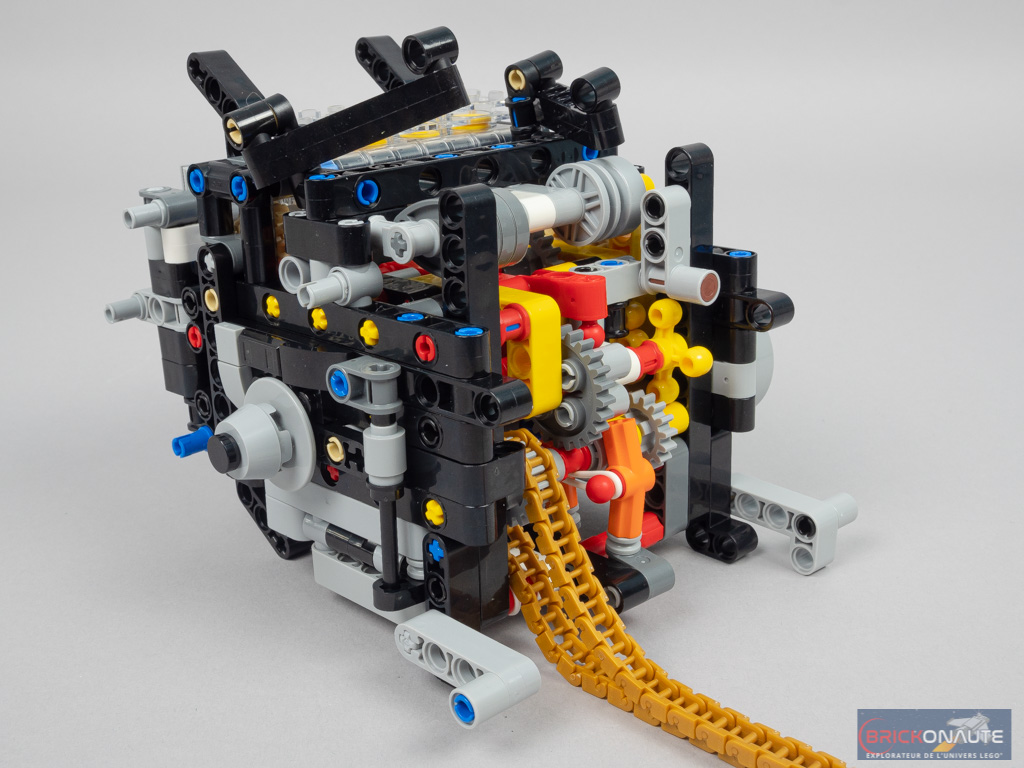 Une fois la boîte assemblée, on construit le moteur et ses 4 cylindres en ligne. Chose assez sympa, les chambres sont transparentes et permettent de voir les pistons se mouvoir. Profitez-en tant qu’il est temps : le moteur devient quasiment invisible une fois la moto terminée. À l’arrière, une longue chaîne dorée entraînera la roue. On termine cette étape avec un peu de « déco », les dissipateurs situés à l’avant et les protubérances situées de chaque côté du moteur.