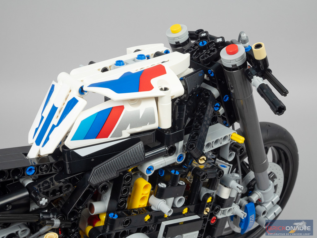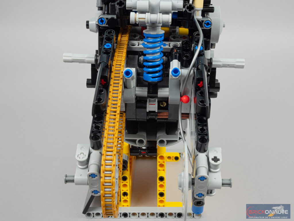 En guise de fonctions, on retrouve évidemment ce que d’autres moto de la gamme LEGO Technic proposent : une direction fonctionnelle, un moteur à pistons mobiles et des amortisseurs. Même si ces derniers sont très particuliers et dimensionnés pour cette moto « XXL » – d’une taille jamais vue jusqu’ici dans la gamme.