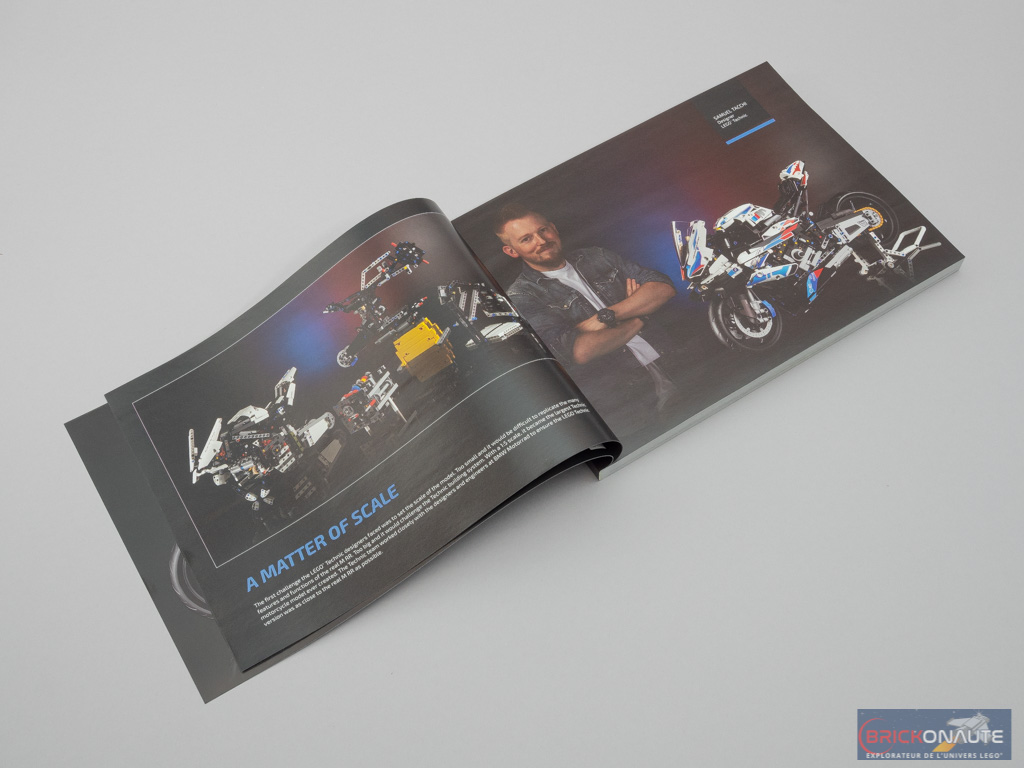 La notice compte 384 pages pour 700 étapes de construction. Elle commence par quelques pages montrant des photos du modèle réel en regard de son alter-ego LEGO, et des éléments relatifs à la genèse du modèle. C’est le français Samuel Tacchi qui est ici aux commandes. Issu d’une école de design de Valenciennes, il a pendant un temps dessiné de véritables motos avant de devenir designer LEGO. On comprend pourquoi il a été choisi pour mener ce projet !