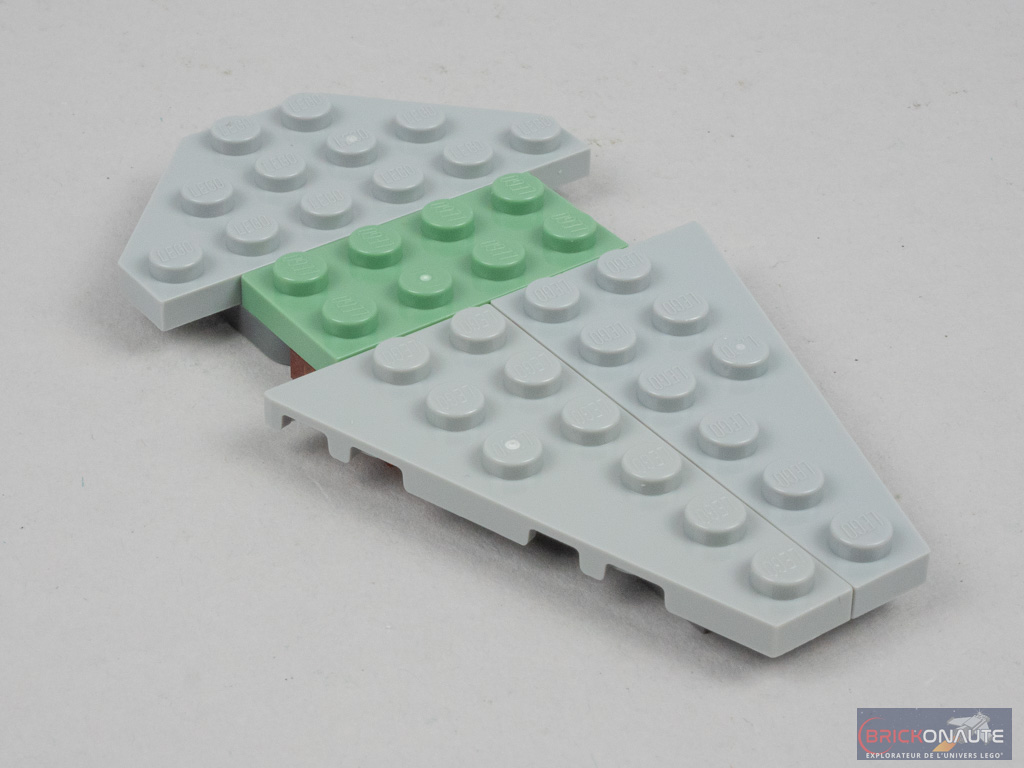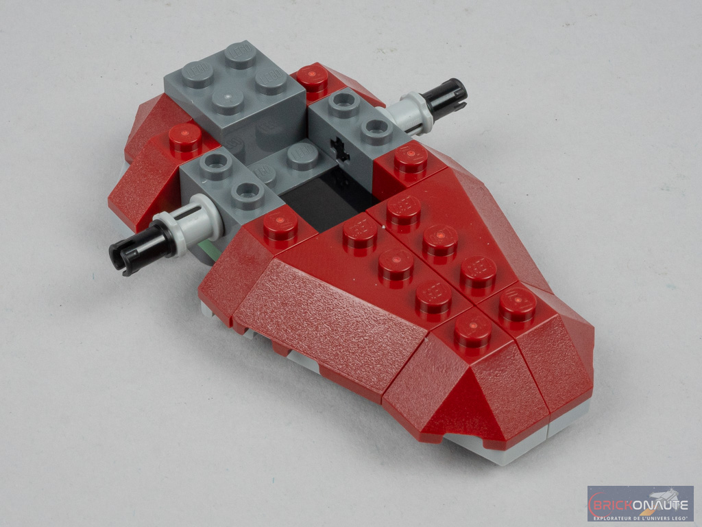 La construction du vaisseau est bouclée en une dizaine de minutes mais n’est pas inintéressante, loin de là. Les ailes sont ici fixées sur des pins Technic et sont donc orientables, que le vaisseau soit en configuration de vol ou bien posé. L’habitacle est construit en deux parties et permet ainsi de positionner le pilote dans deux positions différentes.