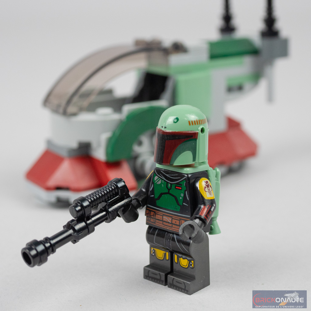 Le Slave I est logiquement piloté par Boba Fett en personne, et la minifig est franchement réussie avec une tampographie très soignée des jambes jusqu’au bout des pieds, du torse et des bras. Sous le casque, la tête est tampographiée des deux côtés mais plutôt qu’un visage alternatif, on retrouve à l’arrière quelques cicatrices. Seul petit regret, la tampographie du casque « bave » un peu – c’est assez visible au niveau du liseré rouge au-dessus des yeux. La minifig proposée ici est identique à celle des sets 75326 Boba Fett’s Throne Room et 75312 Boba Fett’s Starship, à la seule différence que notre chasseur de primes ne dispose pas ici de son communicateur.